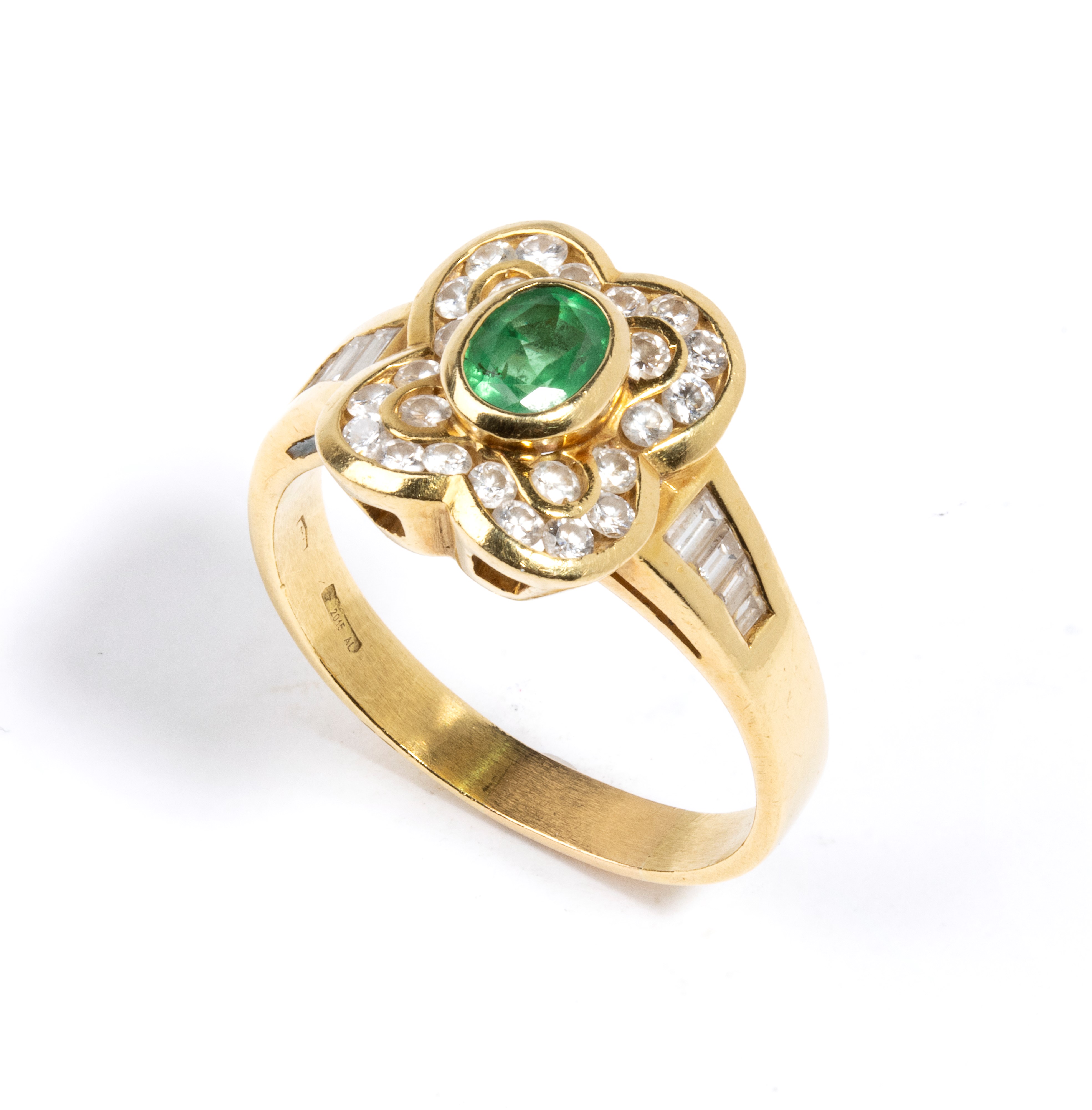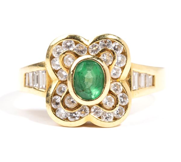 N. 1 oval-shaped emerald, composite cut, estimated weight approx. 0.60 ct; n. 24 round-shaped diamonds, brilliant cut; and 8 rectangular-shaped diamonds, step cut, estimated total weight approx. 1.10 ct, colour G-H, clarity VS, as measured and graded in the setting.