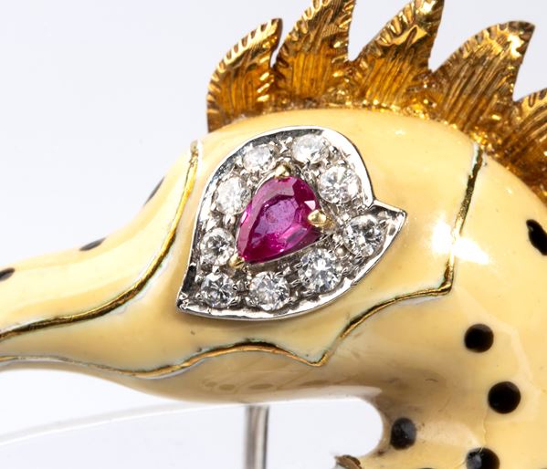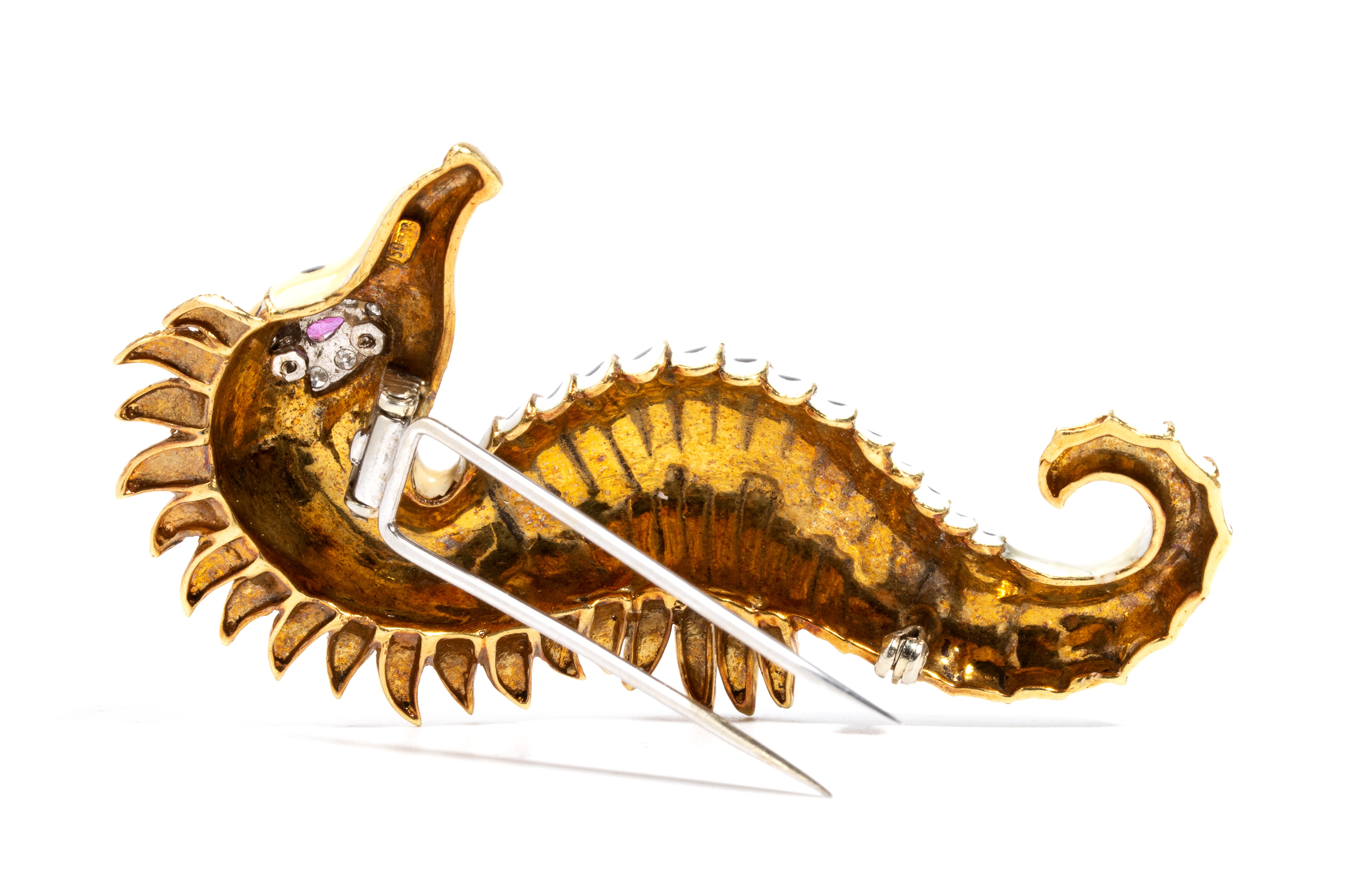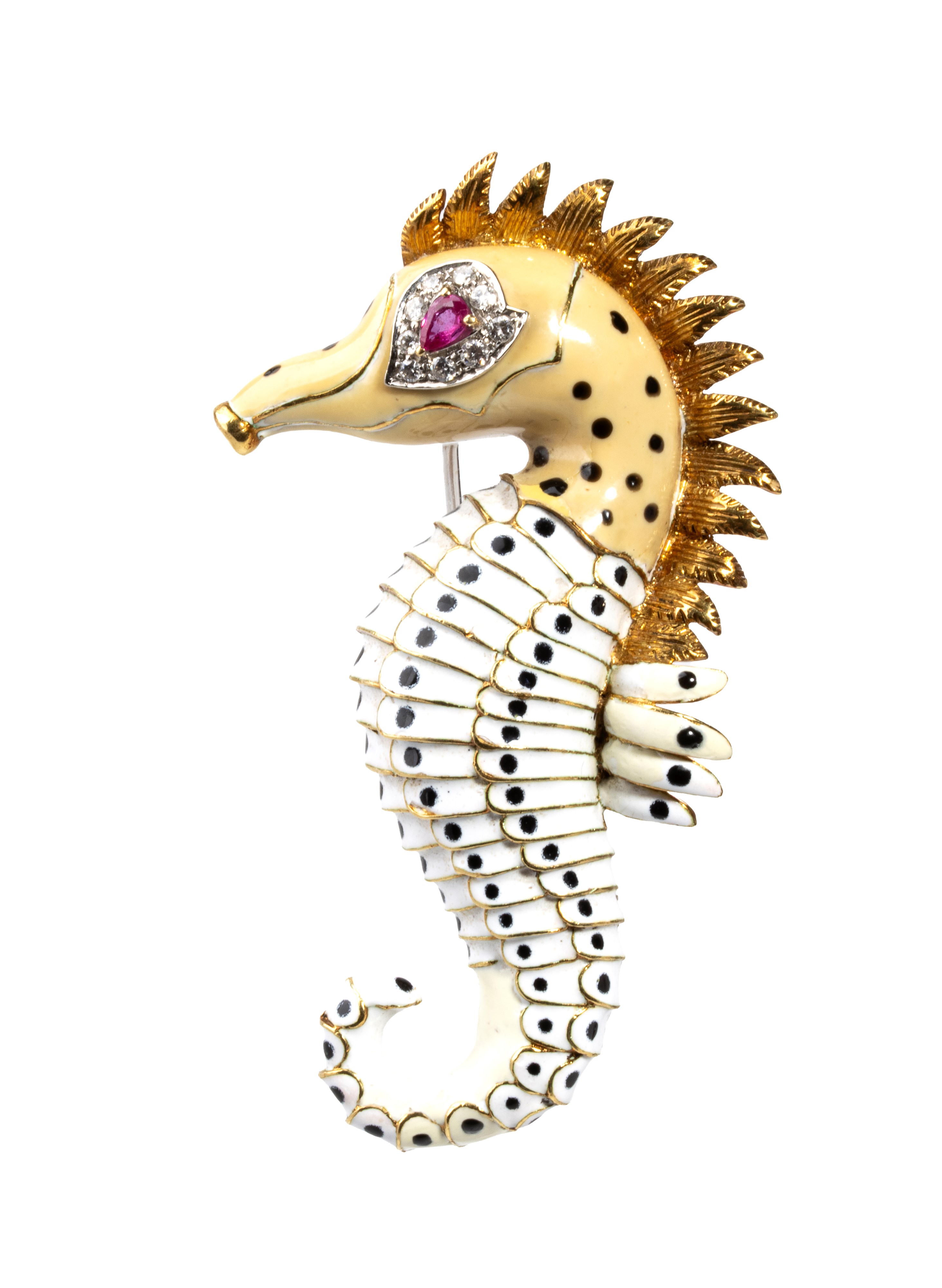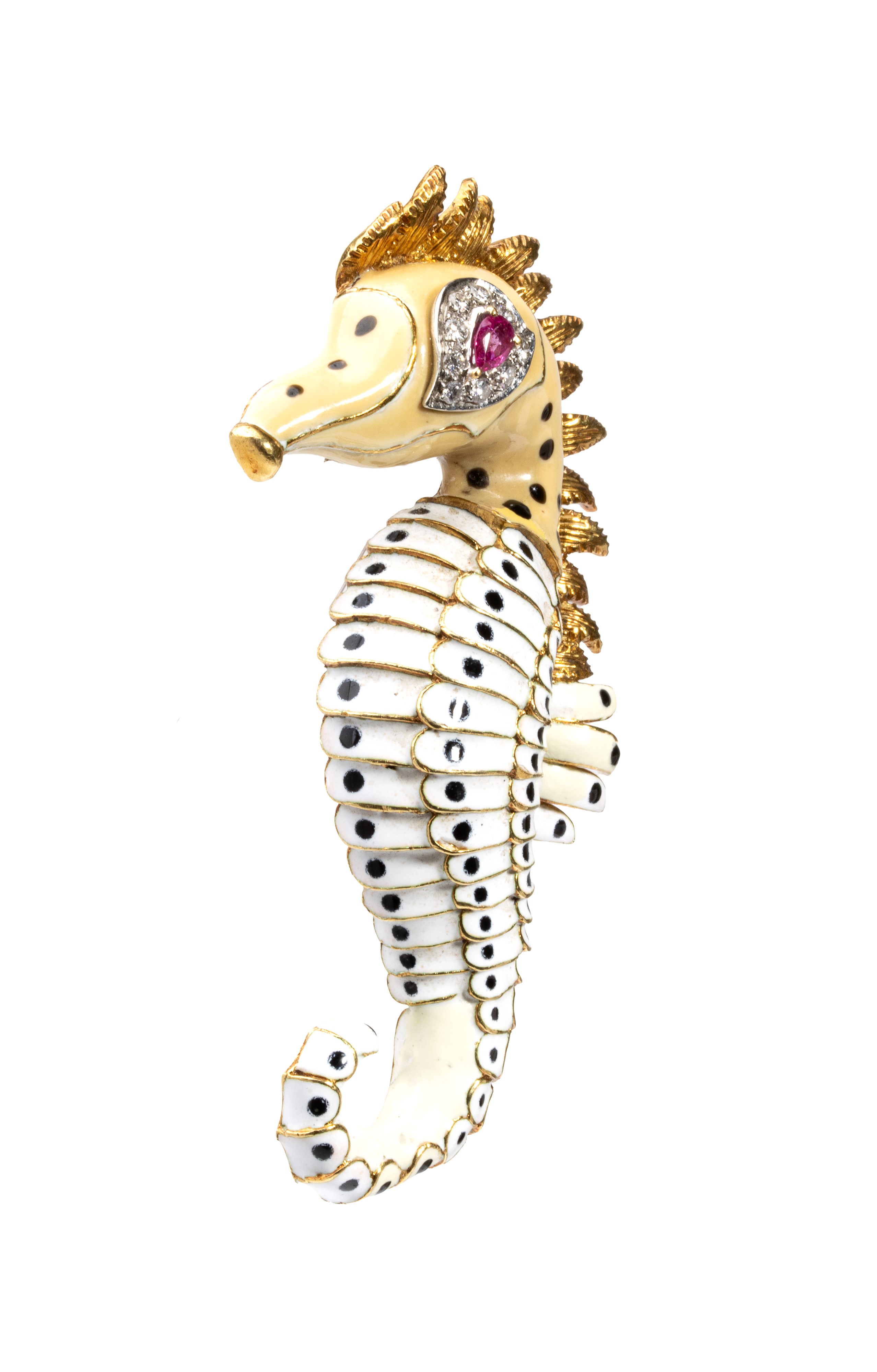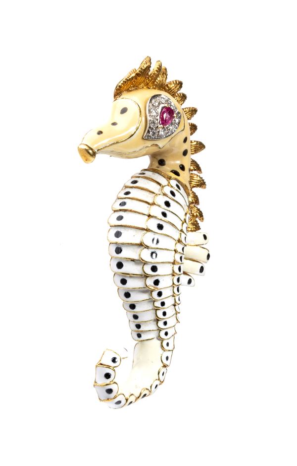 18k yellow gold, depicting a seahorse with a body entirely decorated with enamels, small ruby eye and diamond details.
