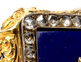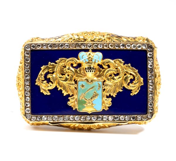 Rectangular in shape with a central coat of arms, decorated with plant and floral motifs along the edges, embellished with a row of rose-cut diamonds and polychrome blue and light blue enamels.