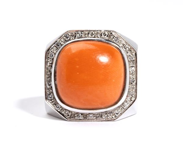 Geometrically shaped, in 18k white gold, set with round brilliant-cut diamonds, approx. 0.20 ct, and a central Mediterranean cabochon cut coral (Corallum Rubrum).