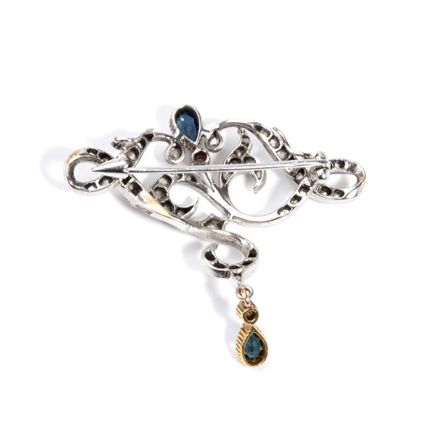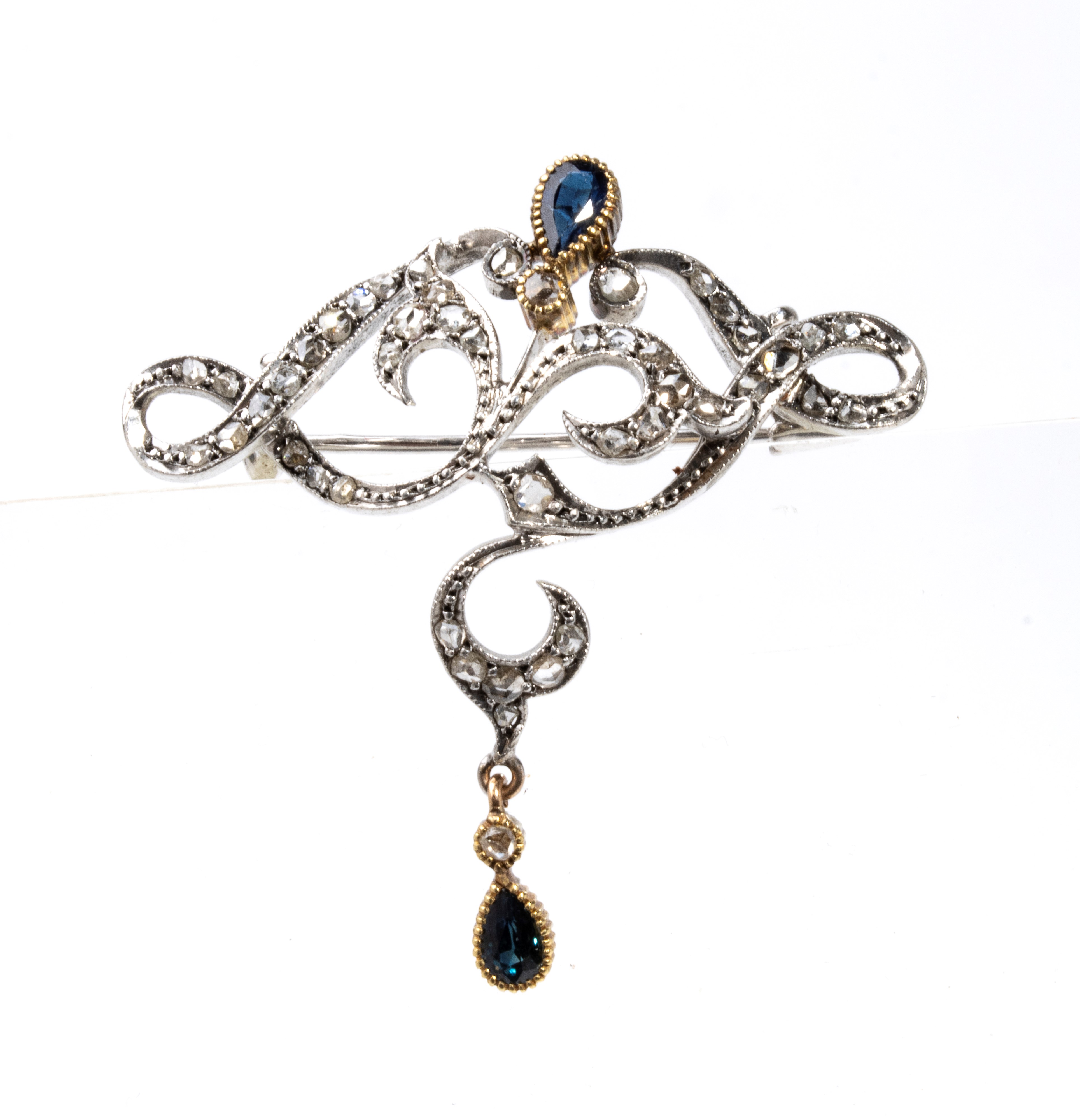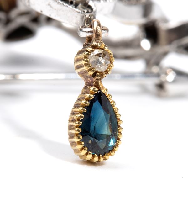 stylised gold floral motif, embellished with two teardrop-shaped sapphires composite cut, approx. 0.50 ct and rose cut diamonds, approx. 0.70 ct), as measured with the mount