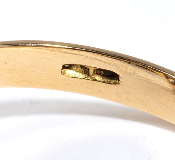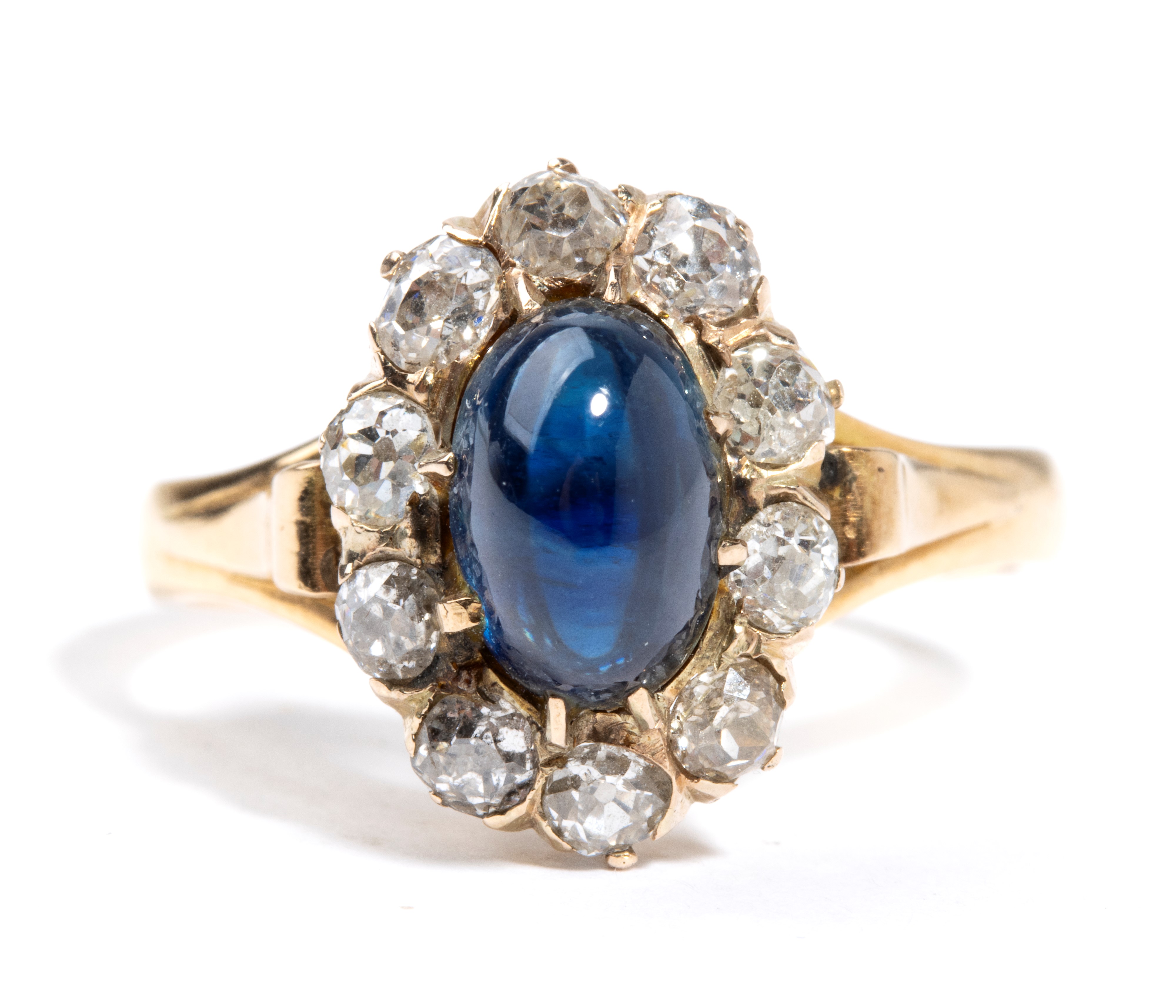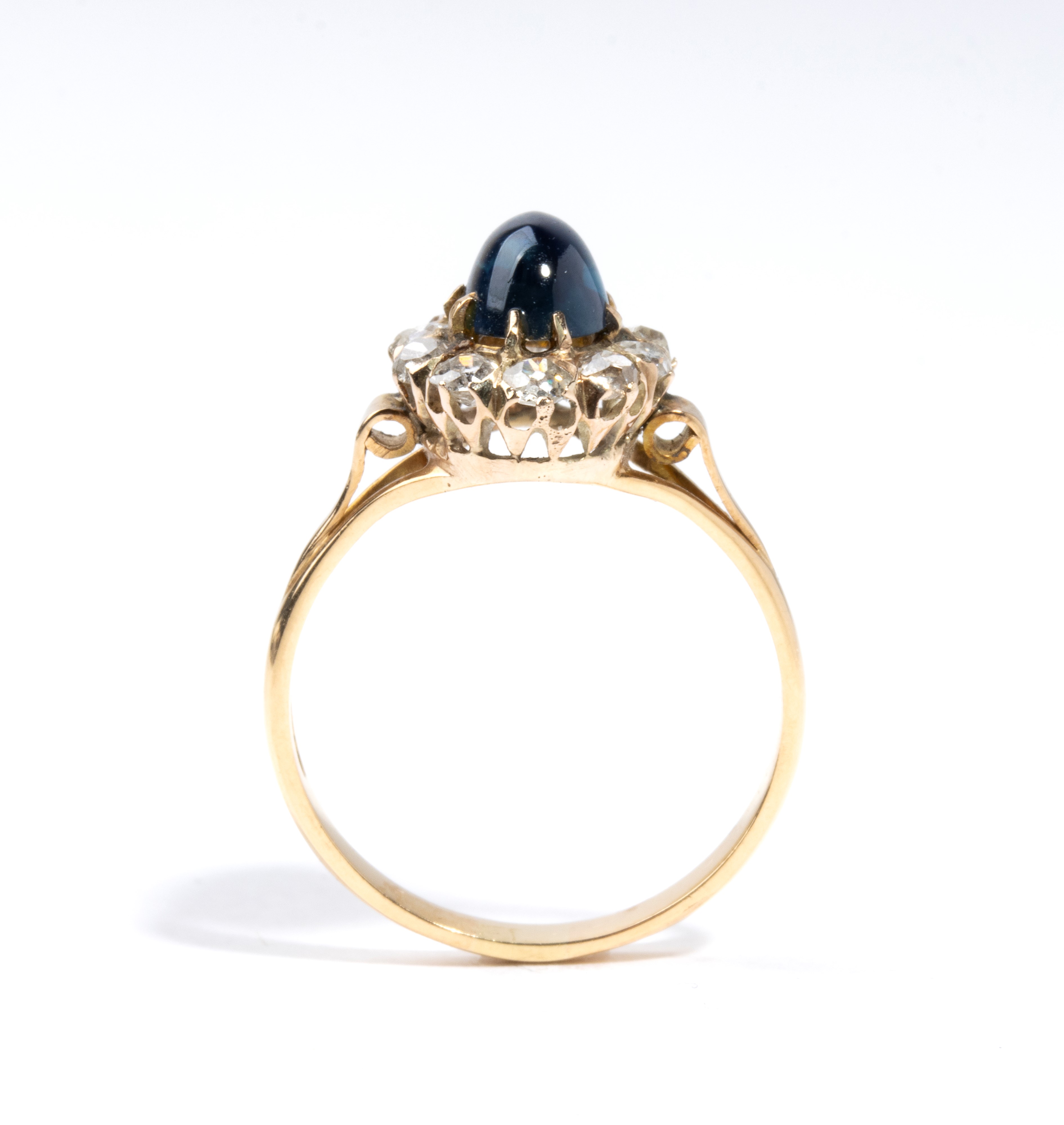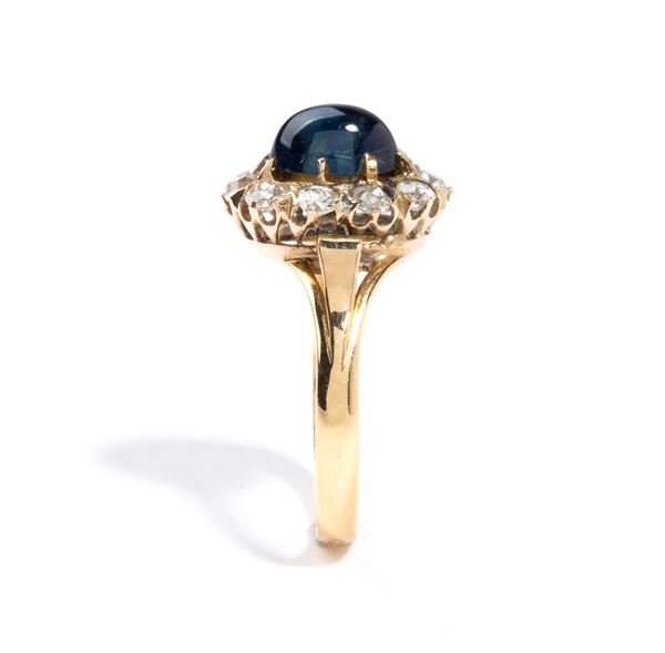 yellow gold, set with a cabochon cut sapphire surrounded by old mine cut diamonds.