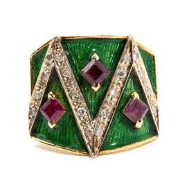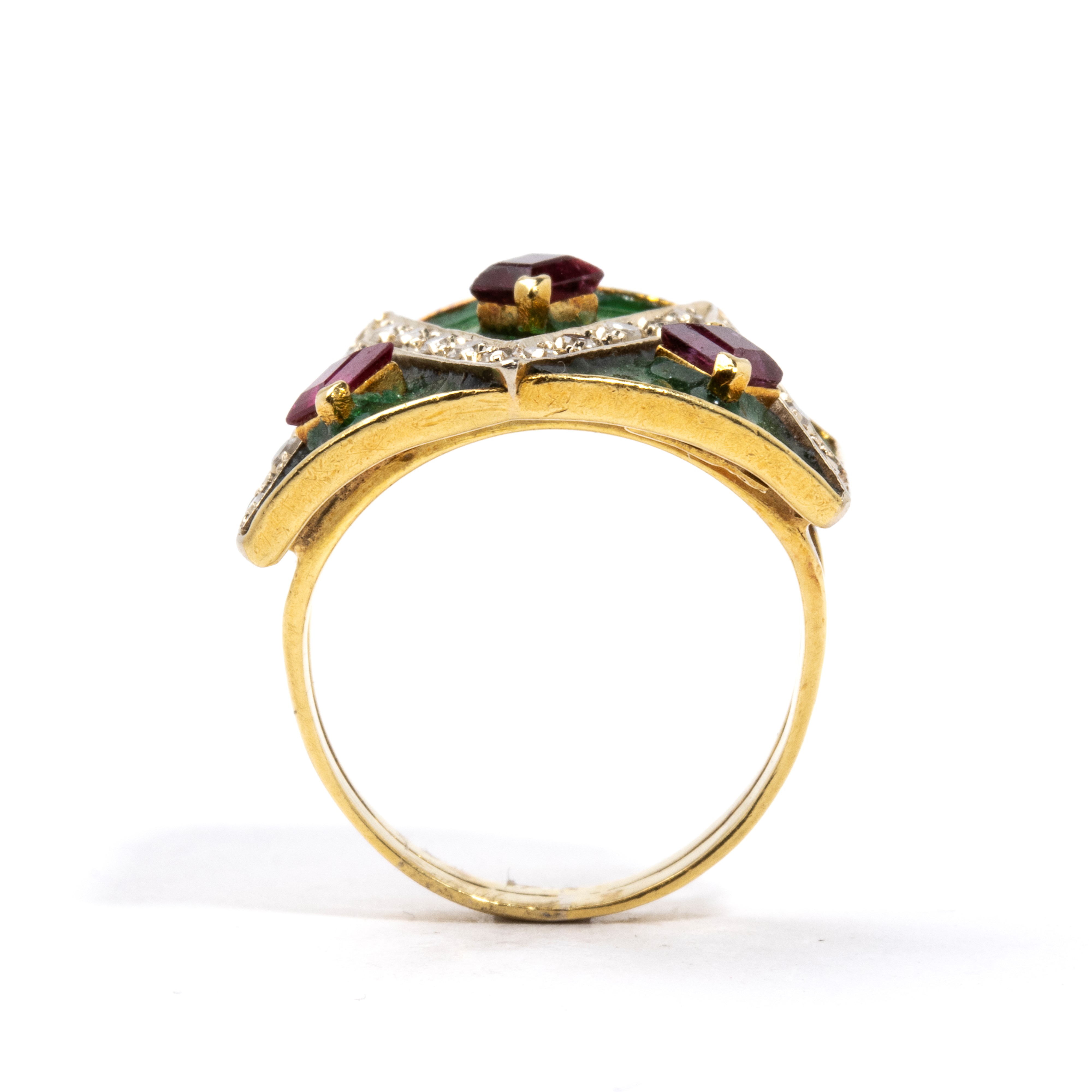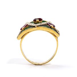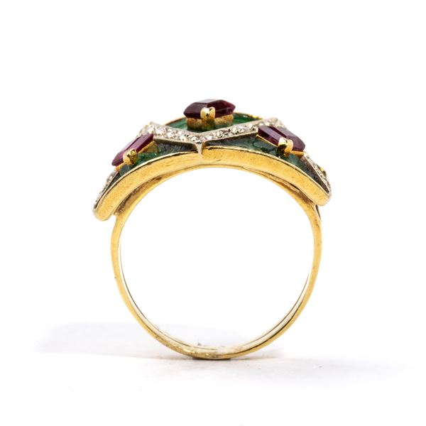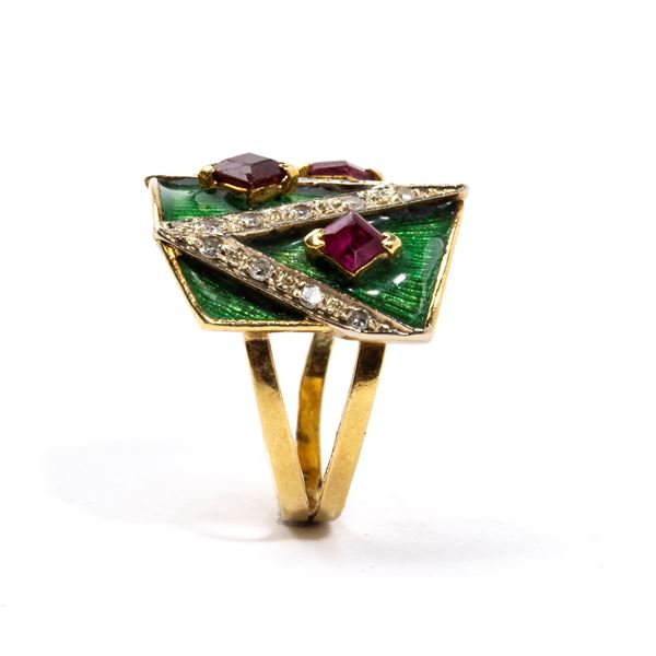 18k yellow gold, with green enamel, round shaped, huit-huit cut, estimated to weight a total of approx. 0.36 ct and n. 3 square-cut rubies, composite cut, estimated to weight a total of approx. 1.10 ct.