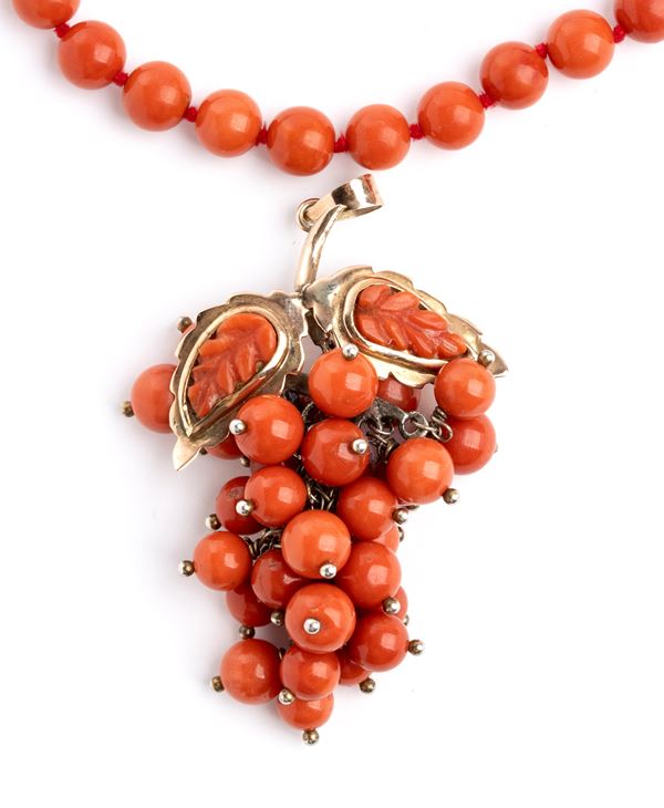 one strand of beads and a grape cluster pendant in Mediterranean red coral (Corallium rubrum), 9k yellow gold and silver mounting and clasp. Signed "MAGLIULO".