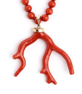 one strand of beads and a dangling sprig of Mediterranean red coral (Corallium Rubrum); 18k yellow gold firmness.