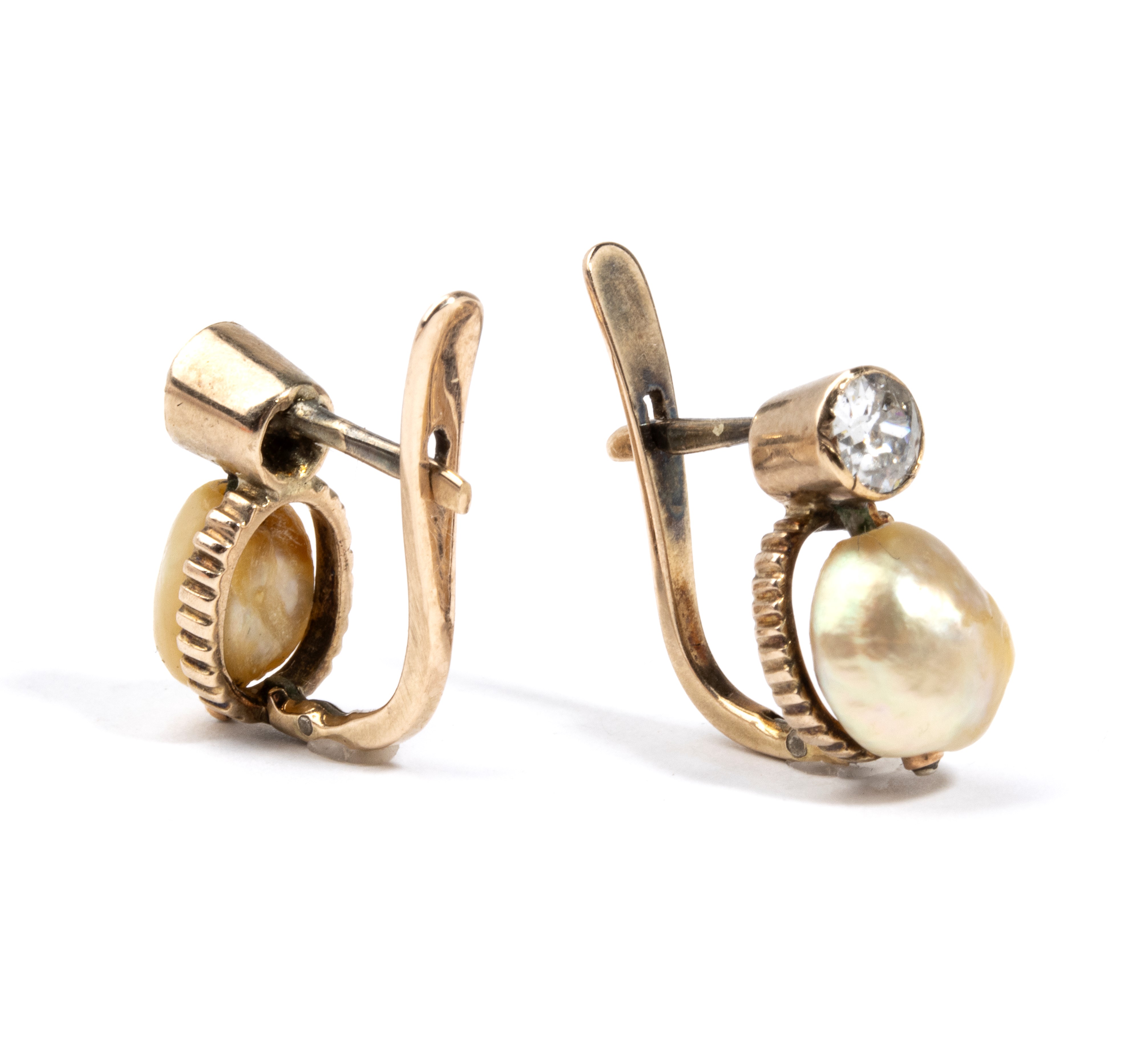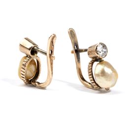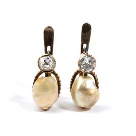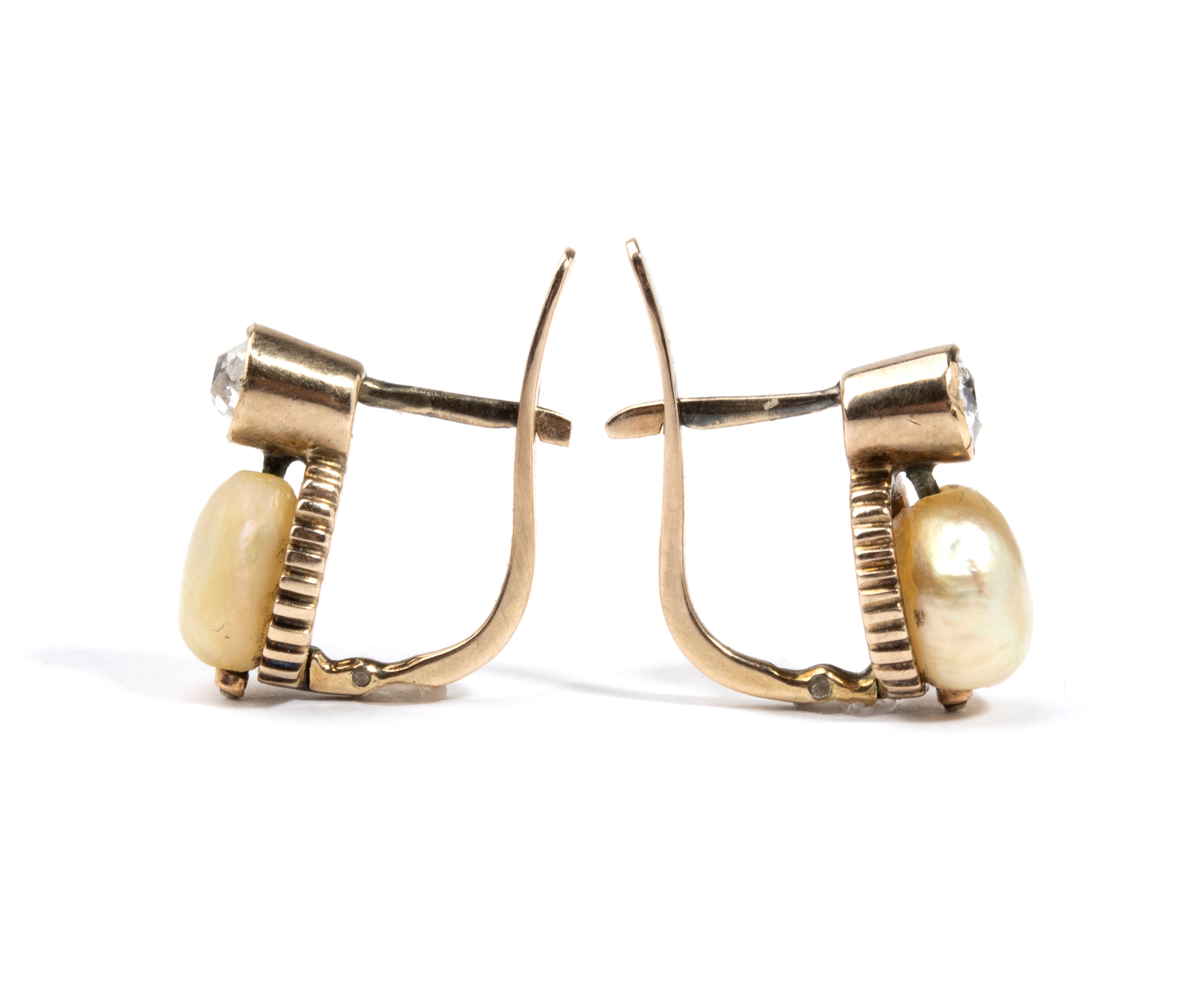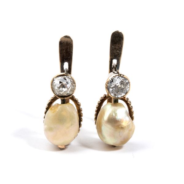 n. 02 natural freshwater pearls and n. 02 round old cut diamonds, approx. 0.70 ct.