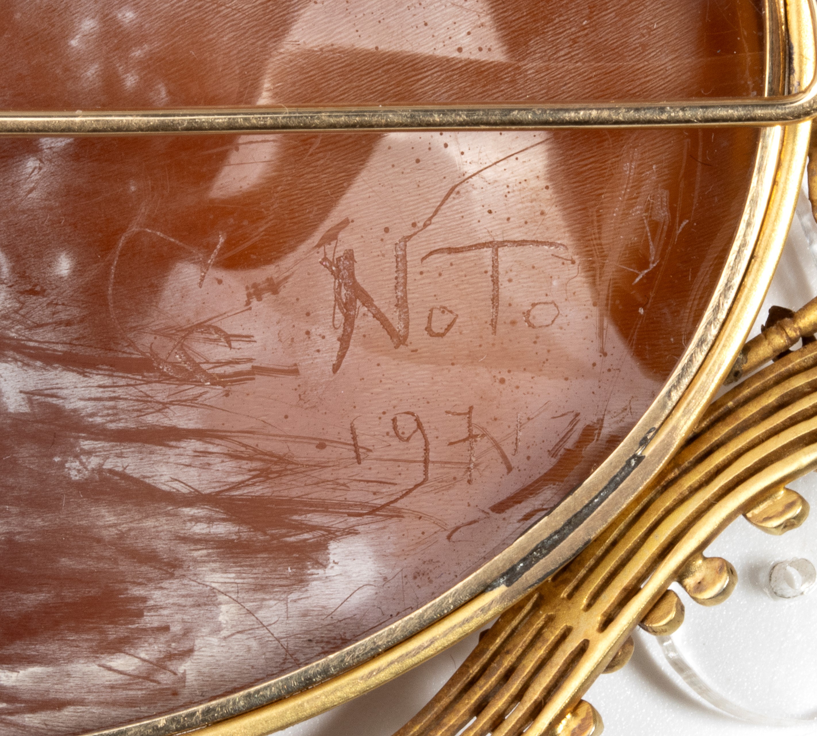 featuring a Sardonica shell carved cameo depicting scene of music and dance in traditional Neapolitan costume, 14kt gold frame adorned with small musical notes and traditional local instruments. Signed ‘NOTO’, 1971.