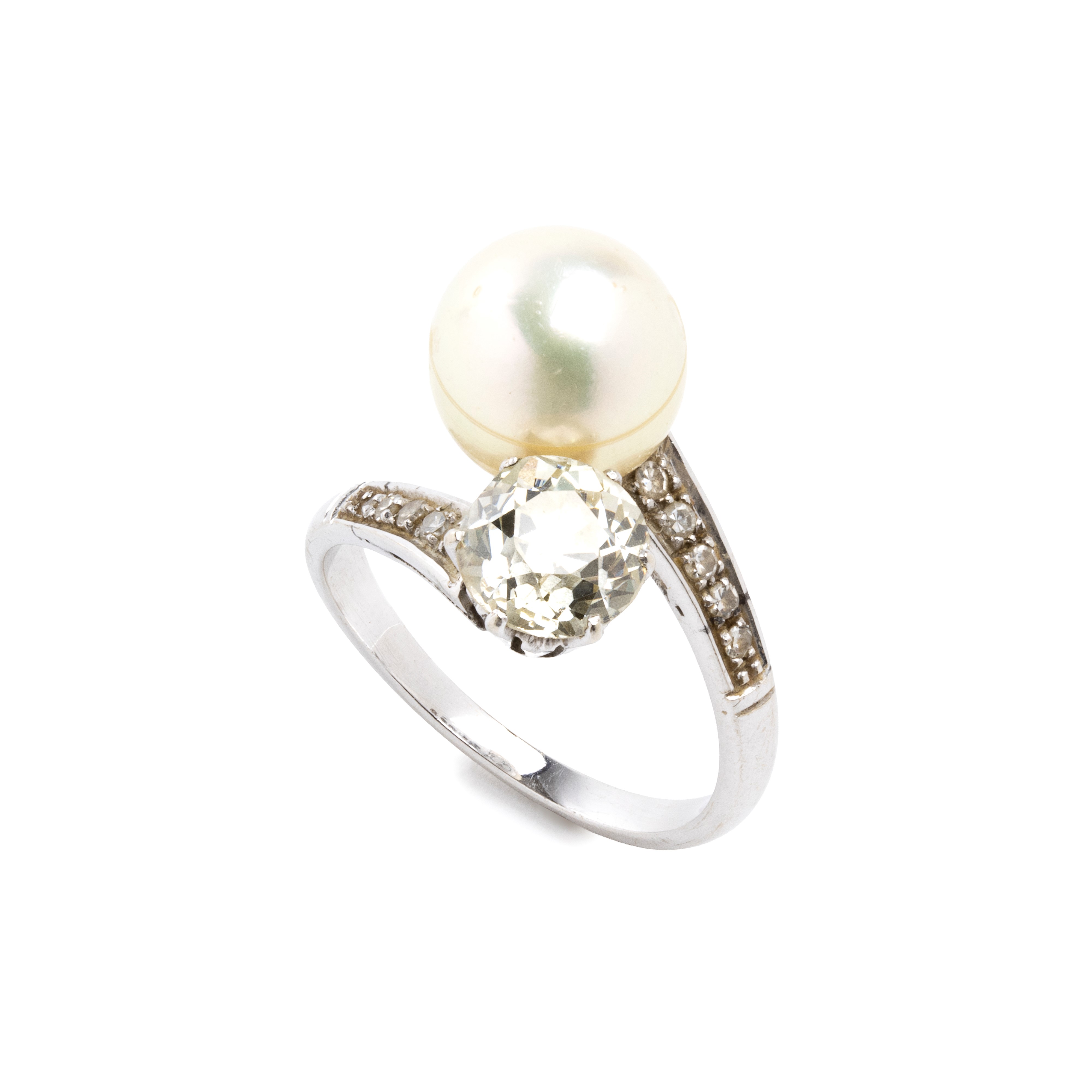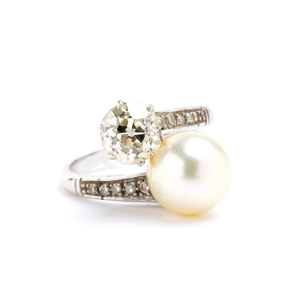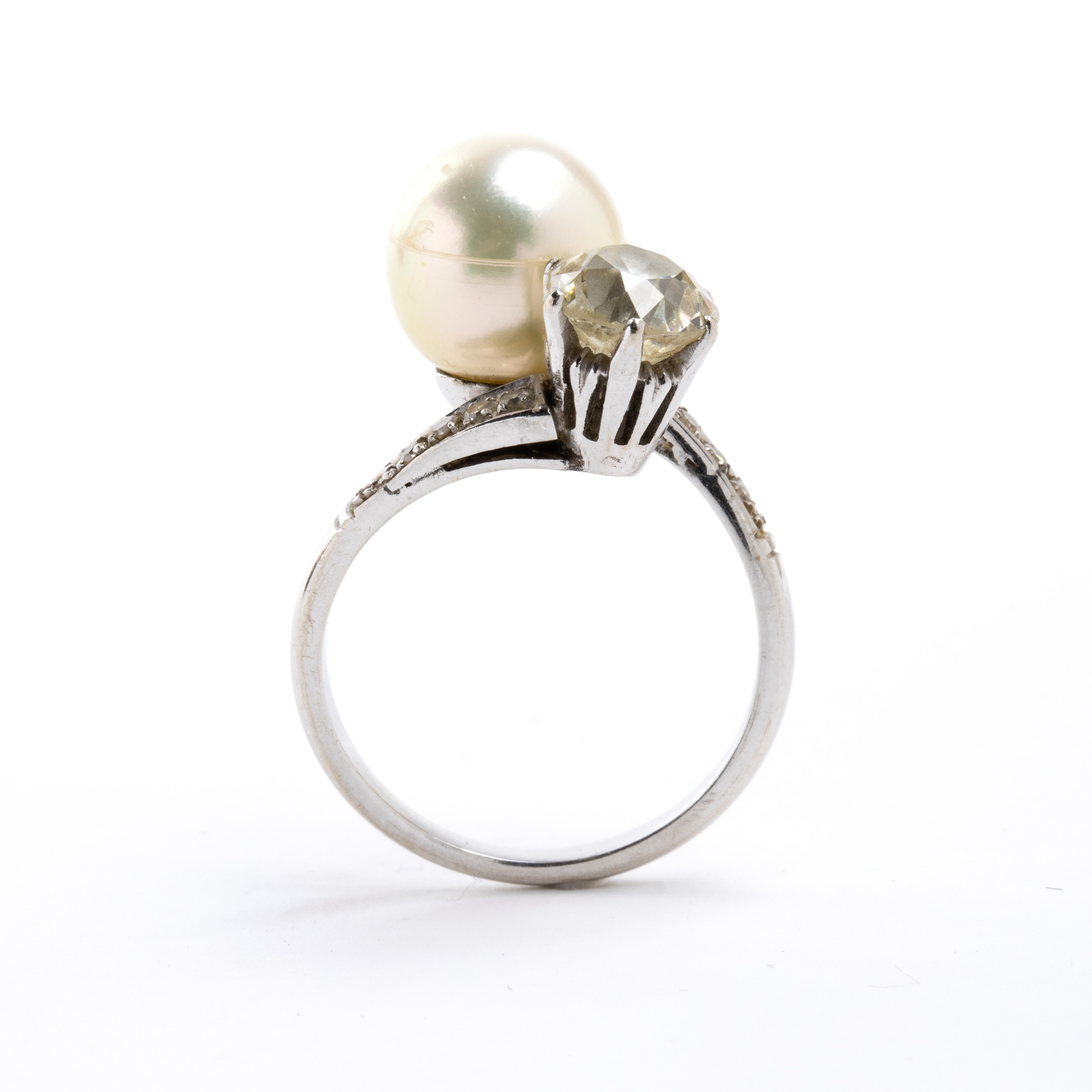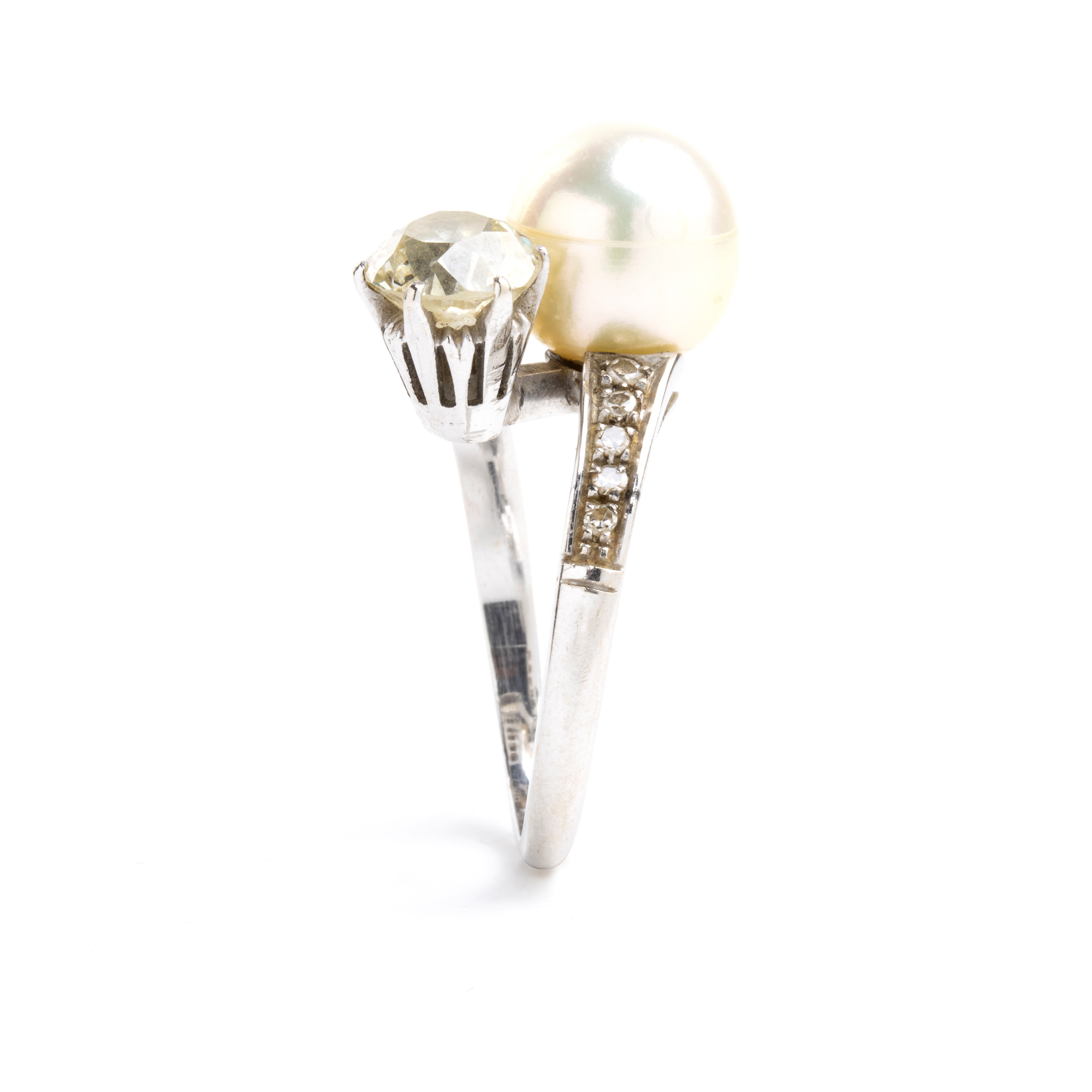white gold, with a saltwater cultured pearl, an old european cut diamond and rows of brilliant cut diamonds.