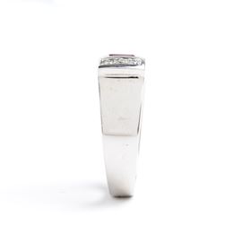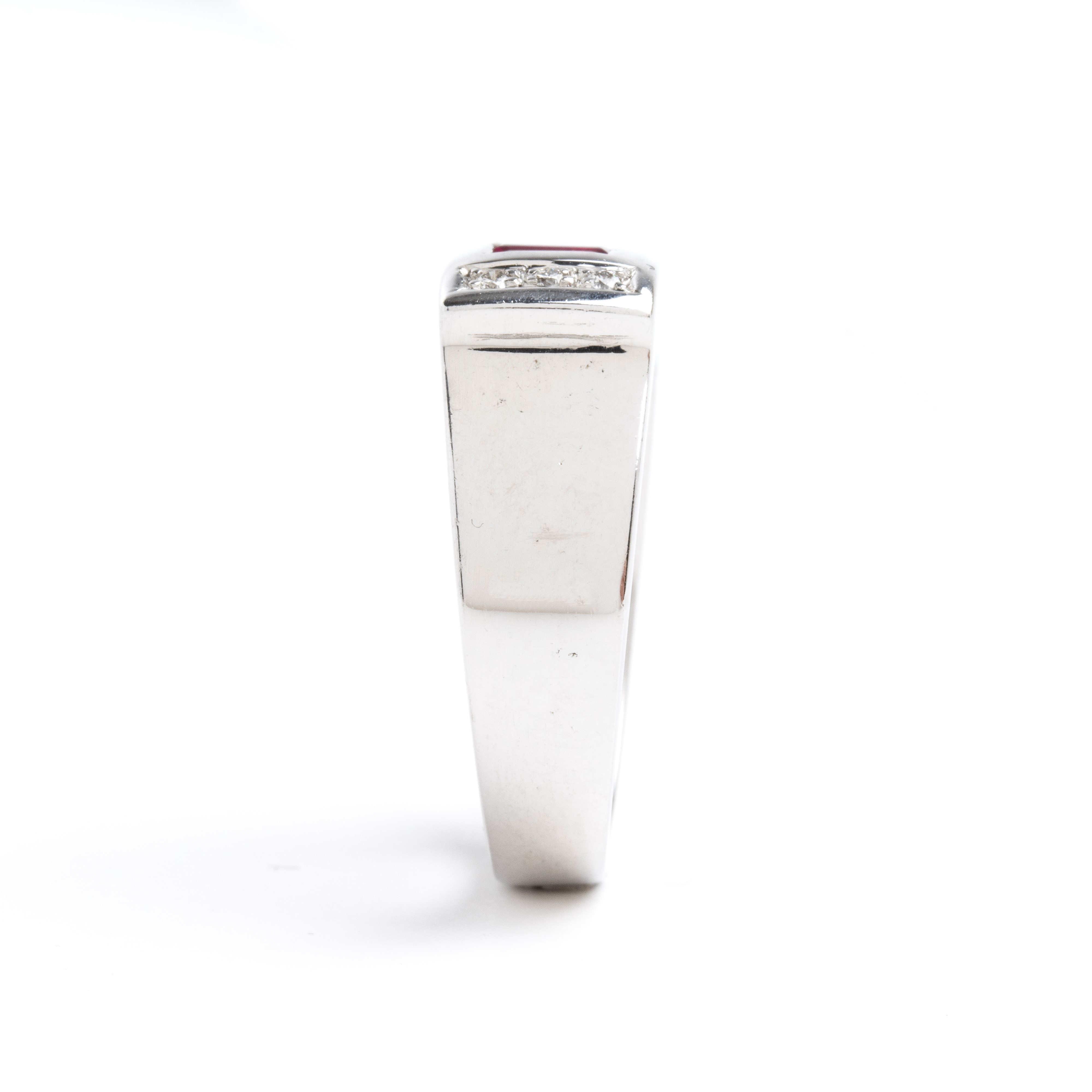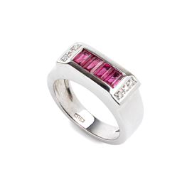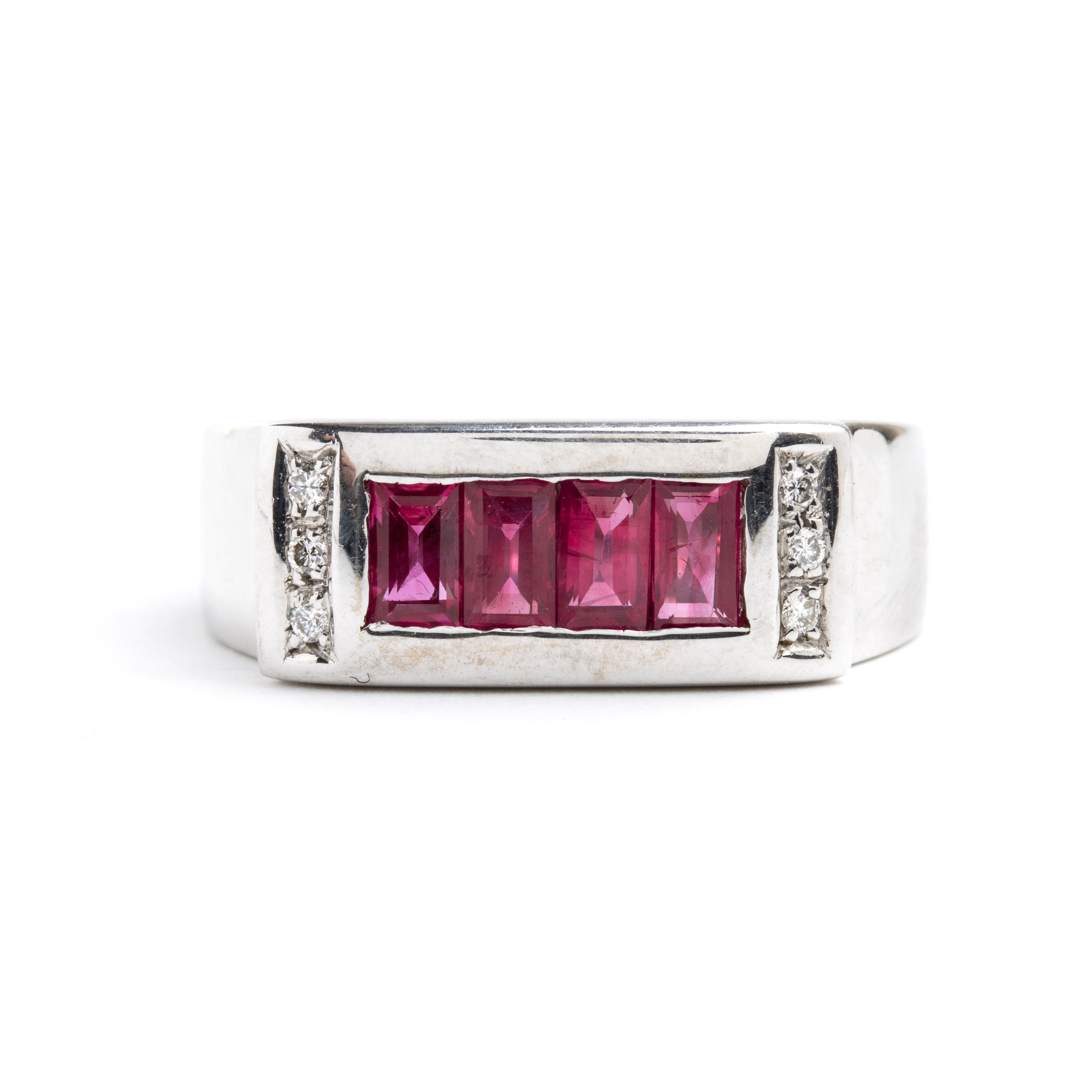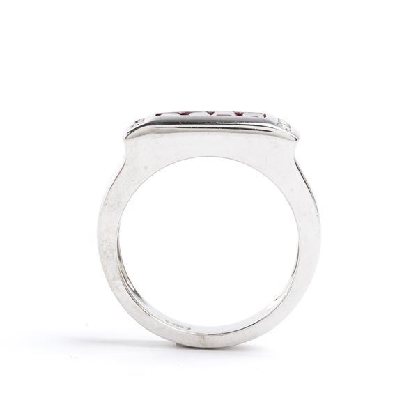 18k white gold ring, set with line of four rectangular shaped rubies, estimated total weight approx. 0.80 ct and n. 06 round brilliant-cut diamonds, estimated total weight approx. 0.04 ct.