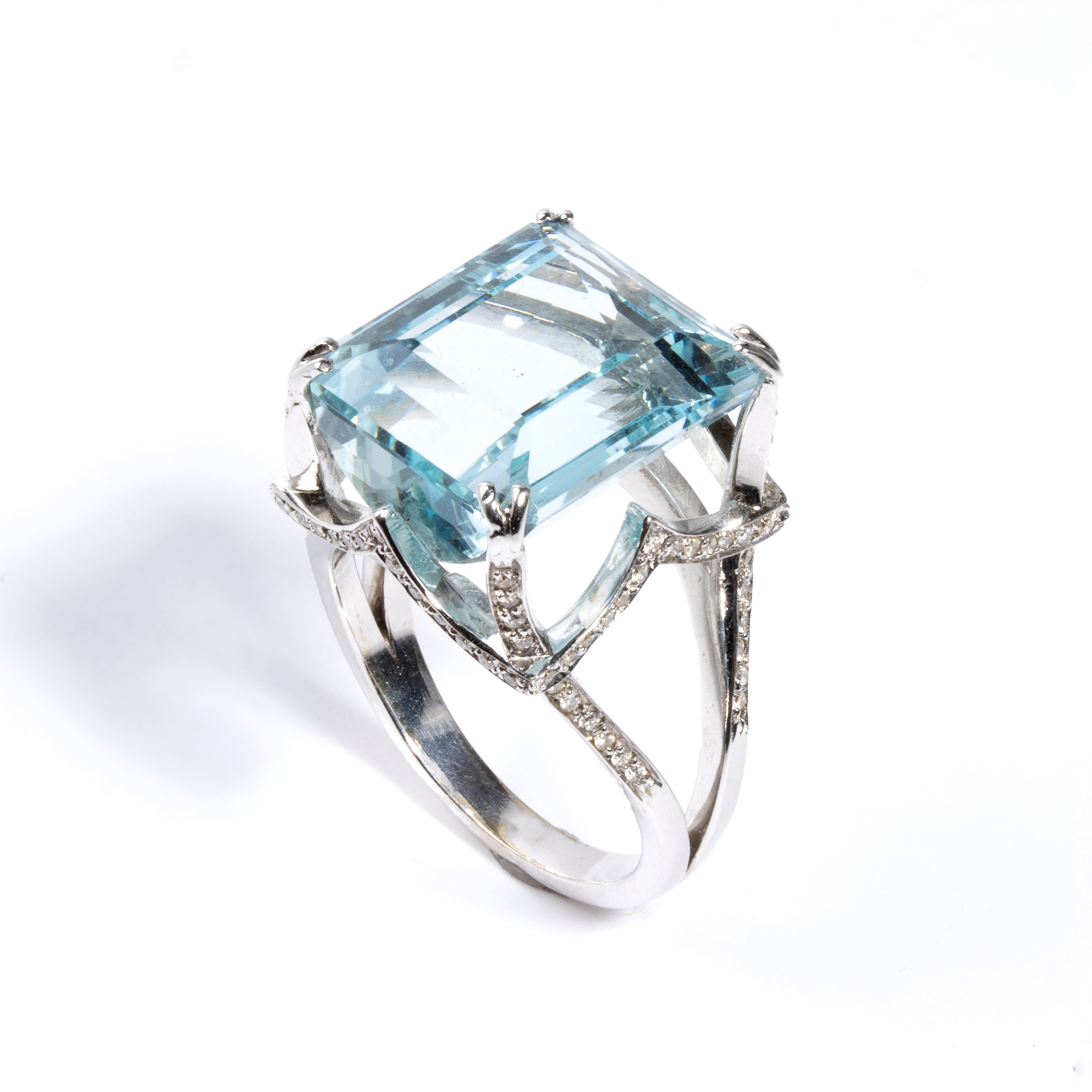 18k white gold, set with a large aquamarine estimated to weigh approximately 18.00 carats, surrounded by diamond ribbons estimated to weigh a total of 0.50 ct, H-I, colour, VS-SI clarity.