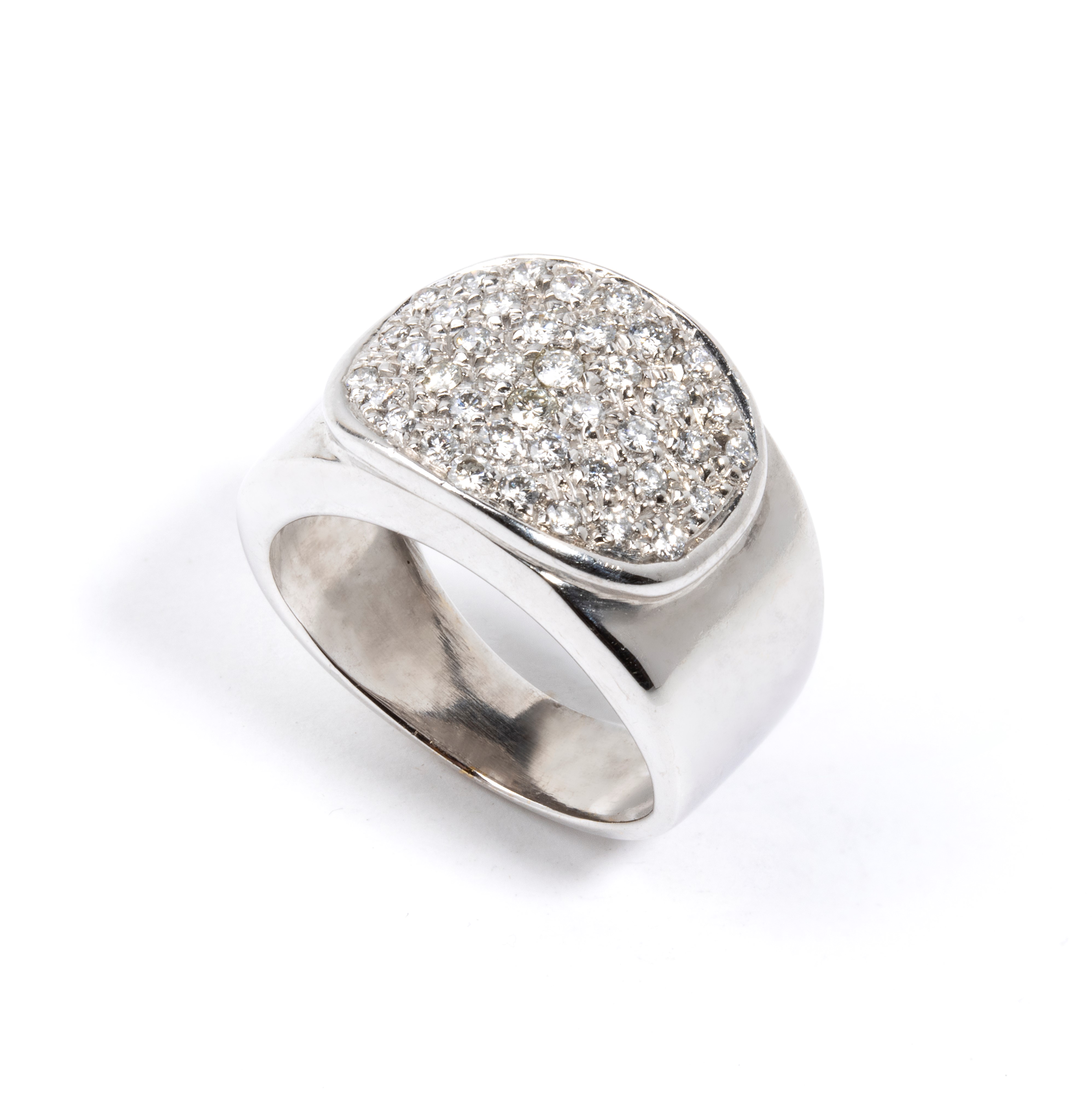 white gold, set with pavé set round brilliant-cut diamonds, estimated to weight a total of approx. 0.85 ct, colour F-G, clarity VVS-VS, as measured and graded in the setting.