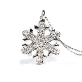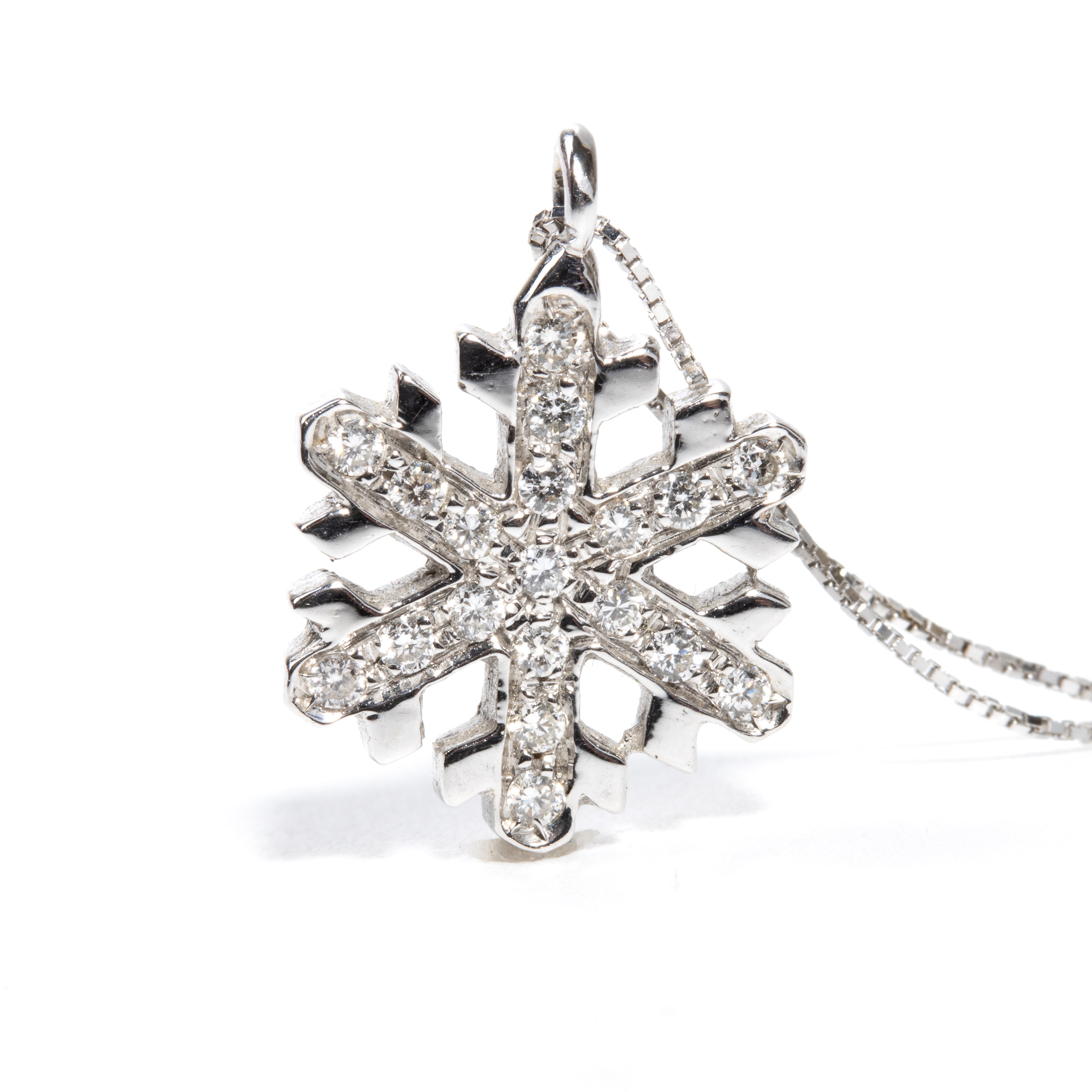 18k white gold, with a delicate chain from which hangs a pendant in the shape of a snowflake, set with brilliant cut diamonds estimated to weight a total of approx. 0.22 ct, F-G colour, VVS-VS clarity.