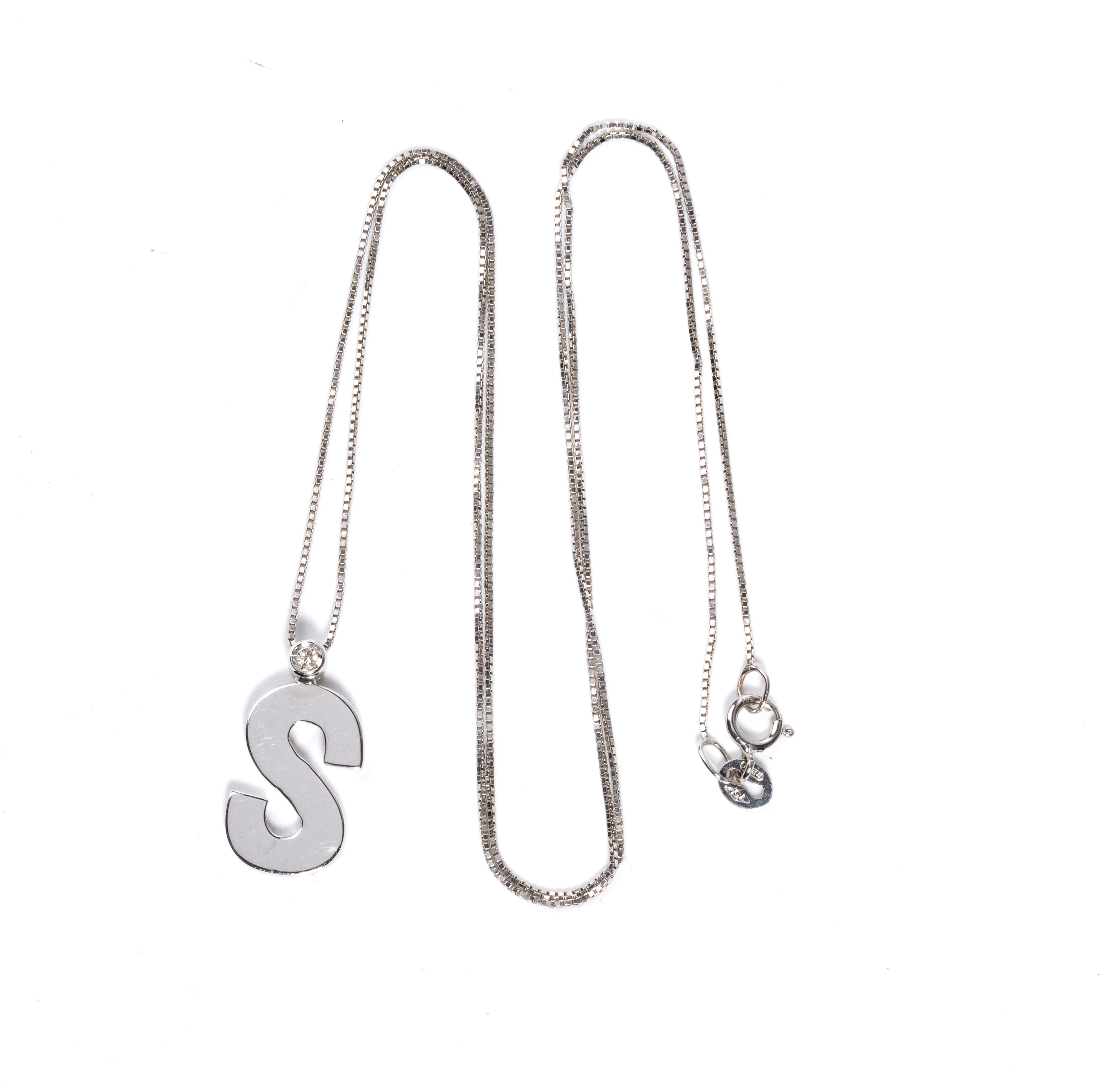18k white gold, with a delicate chain from which hangs a pendant, in the shape of the letter S, surmounted by a round brilliant cut diamond estimated to weight 0.02 ct.