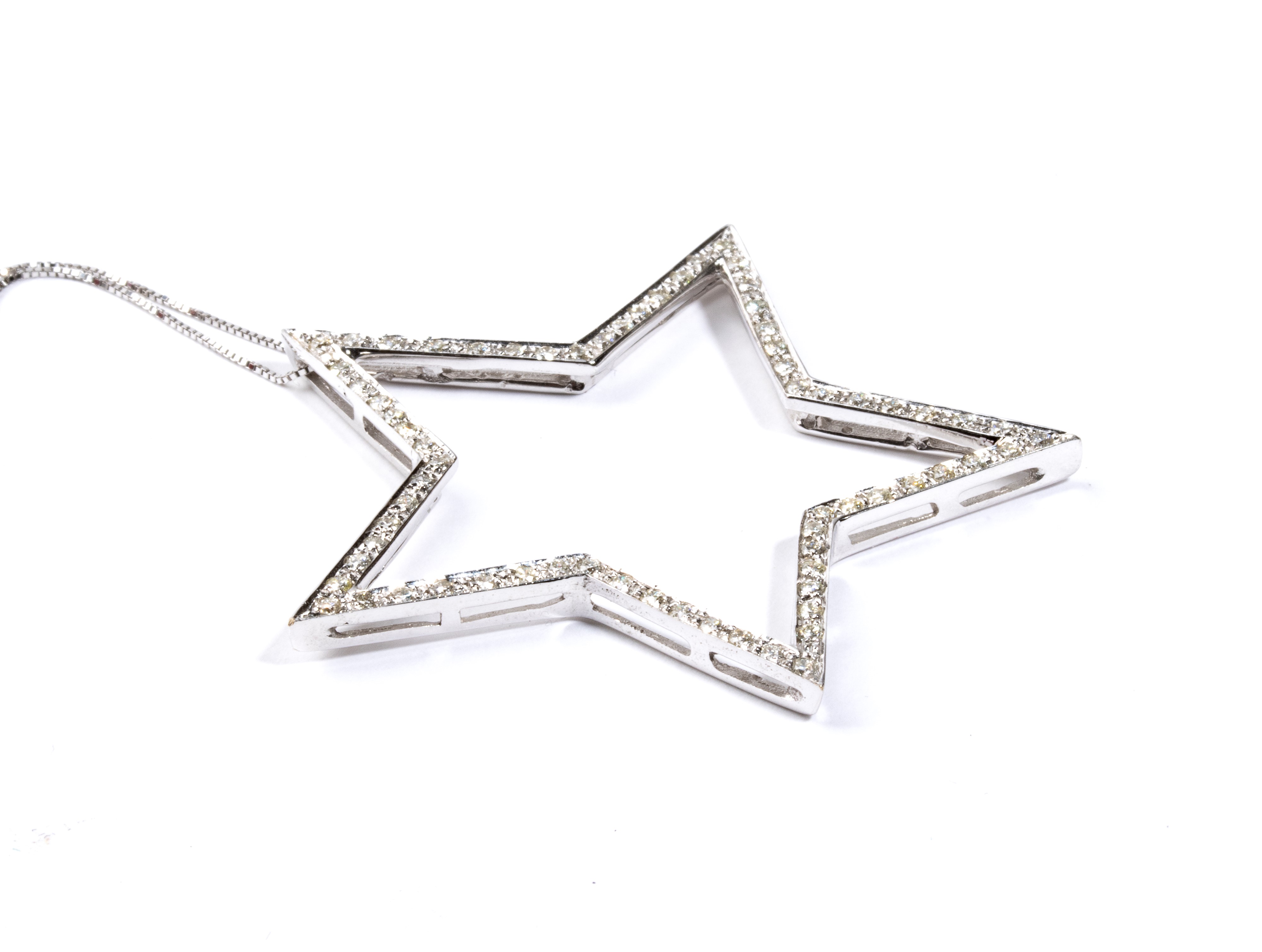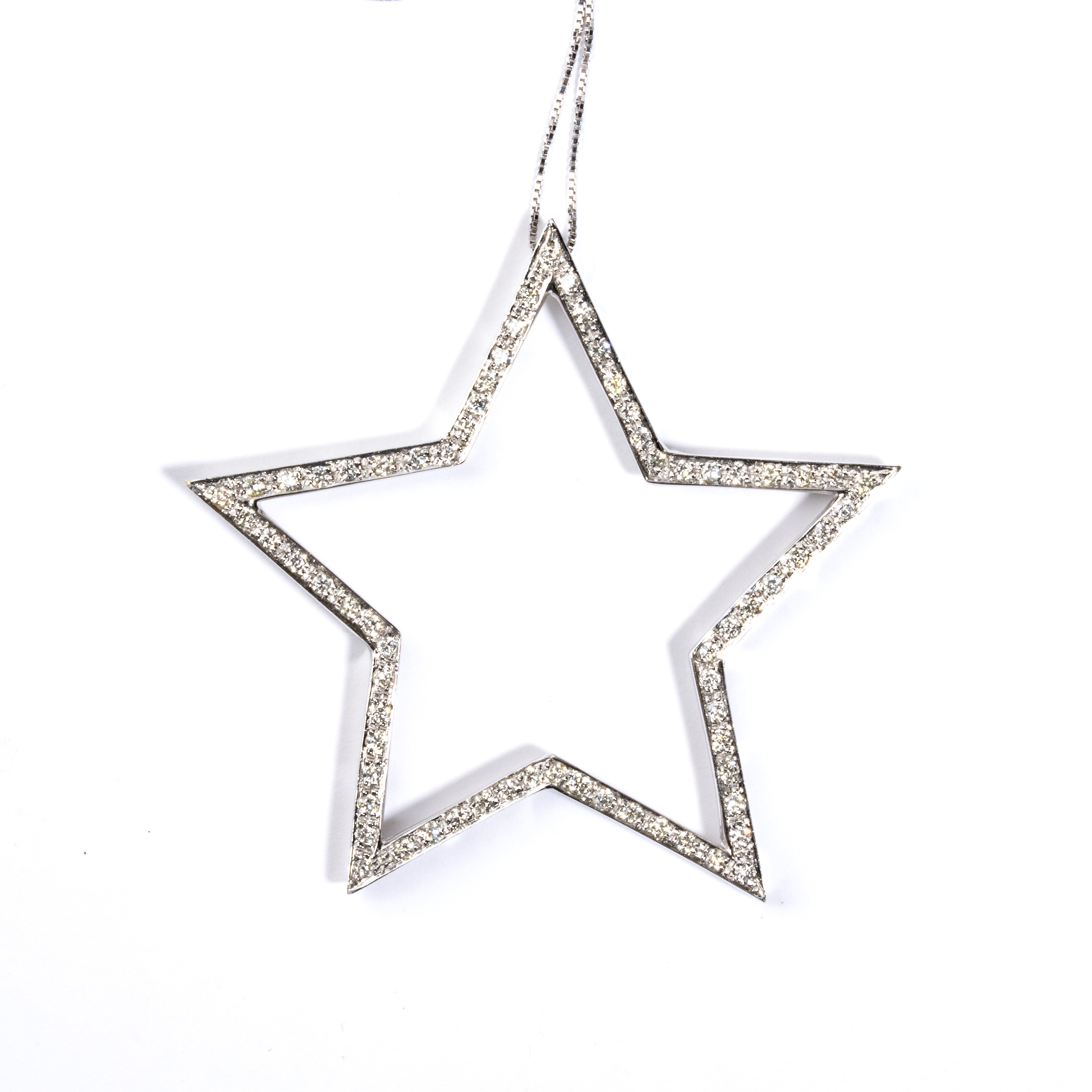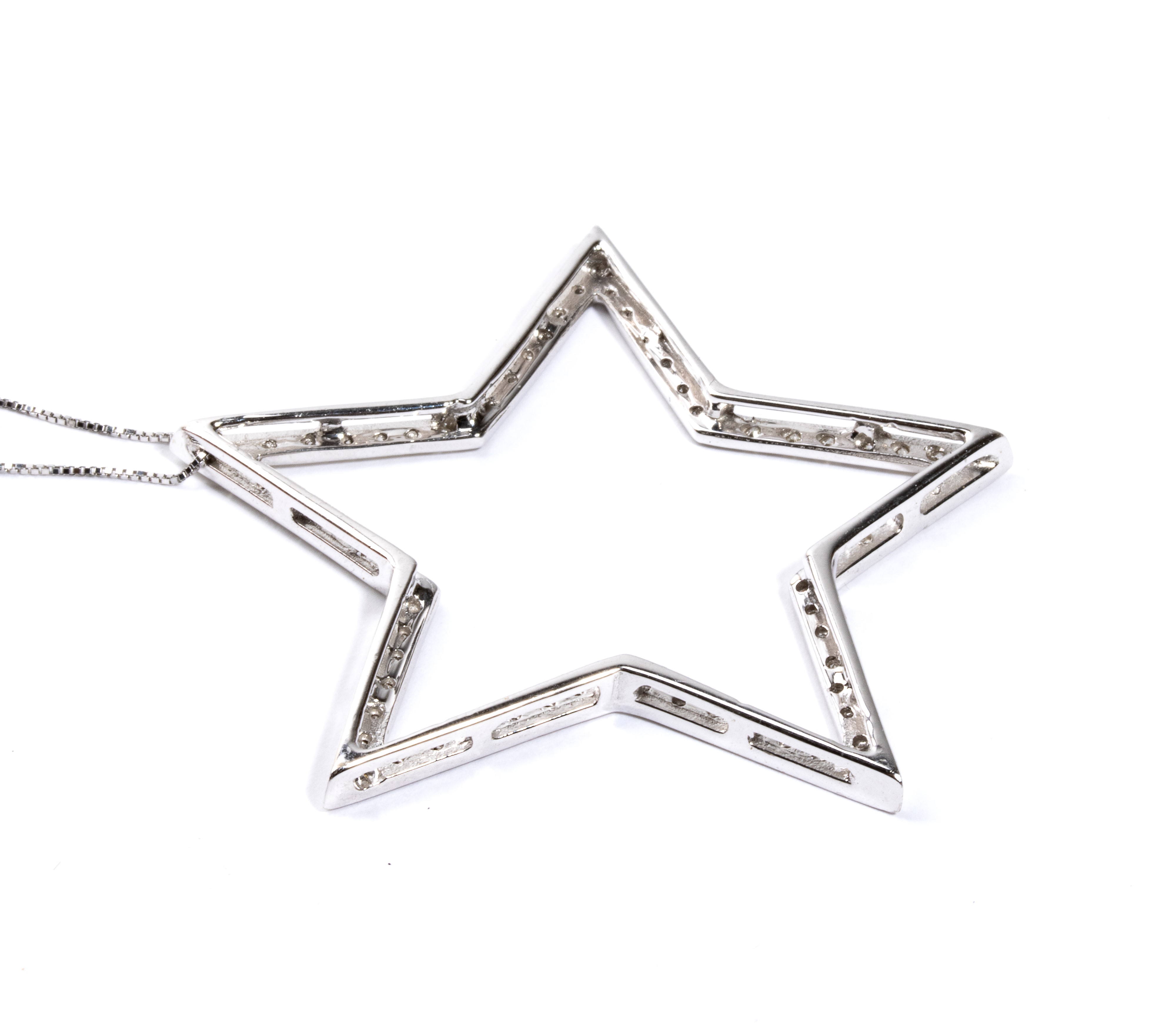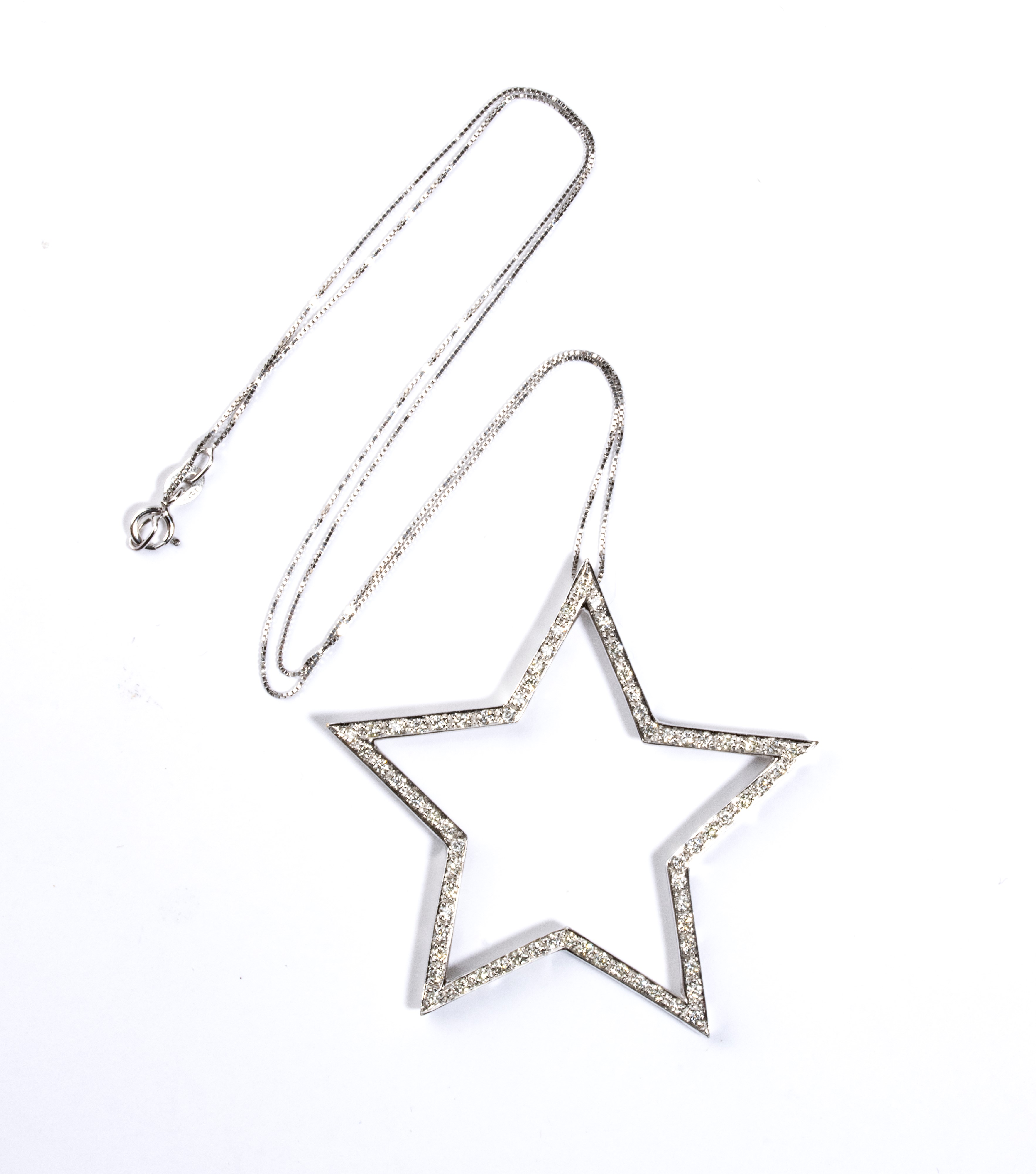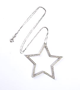 18k white gold, with thin chain from which hangs pendant set with round brilliant-cut diamonds, estimated to weigh a total of approx. 0.70 ct, G colour, VS clarity, as gauged and graded in the mount.