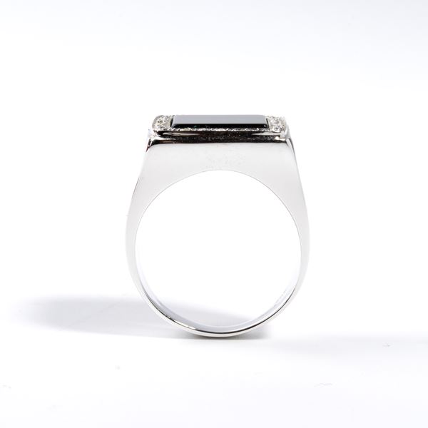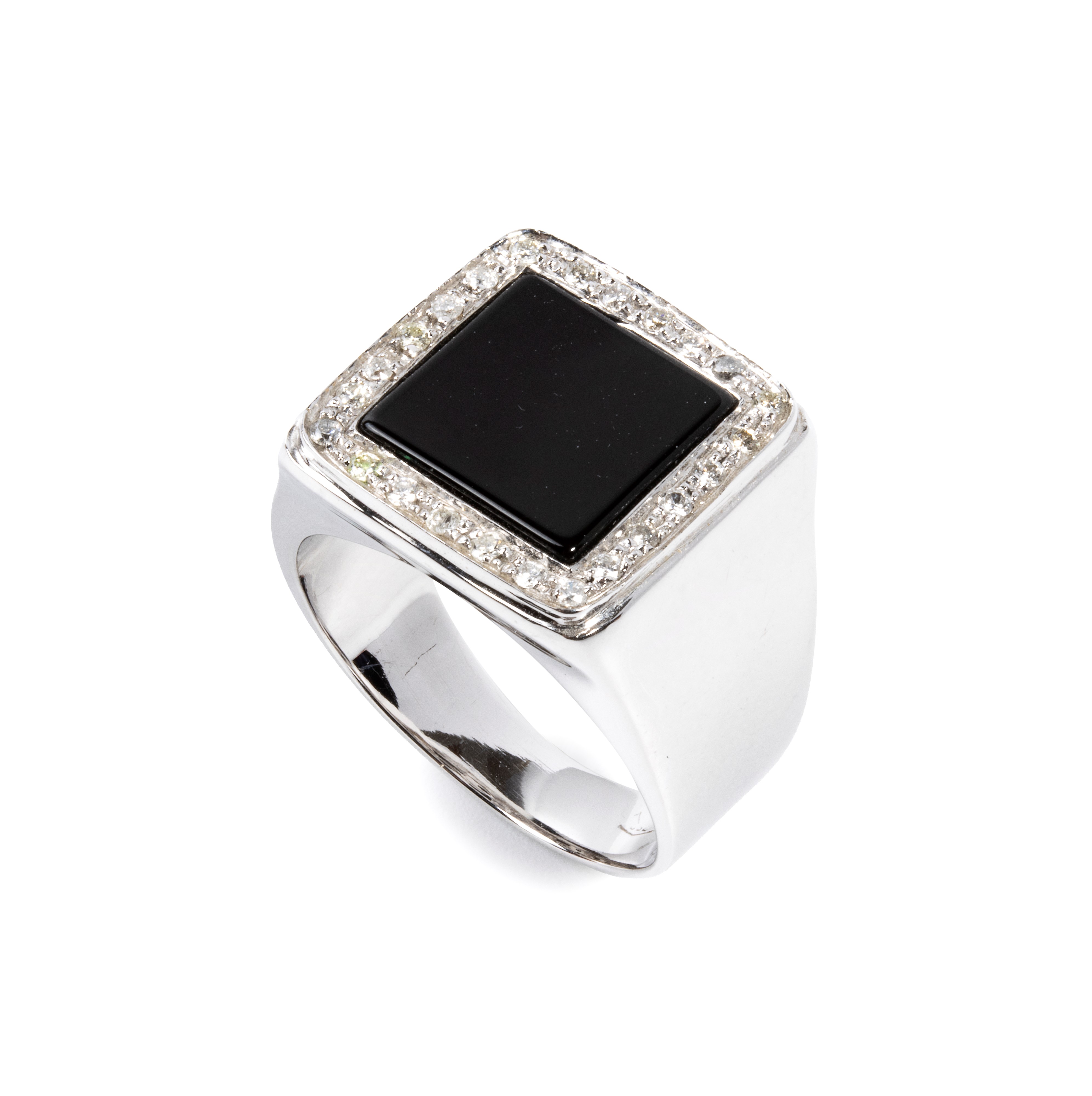 18k white gold, set with onyx framed by brilliant cut diamonds estimated to weight a total of approx. 0.15 ct, G-H colour, VS-SI clarity, as gauged and graded in the mount.