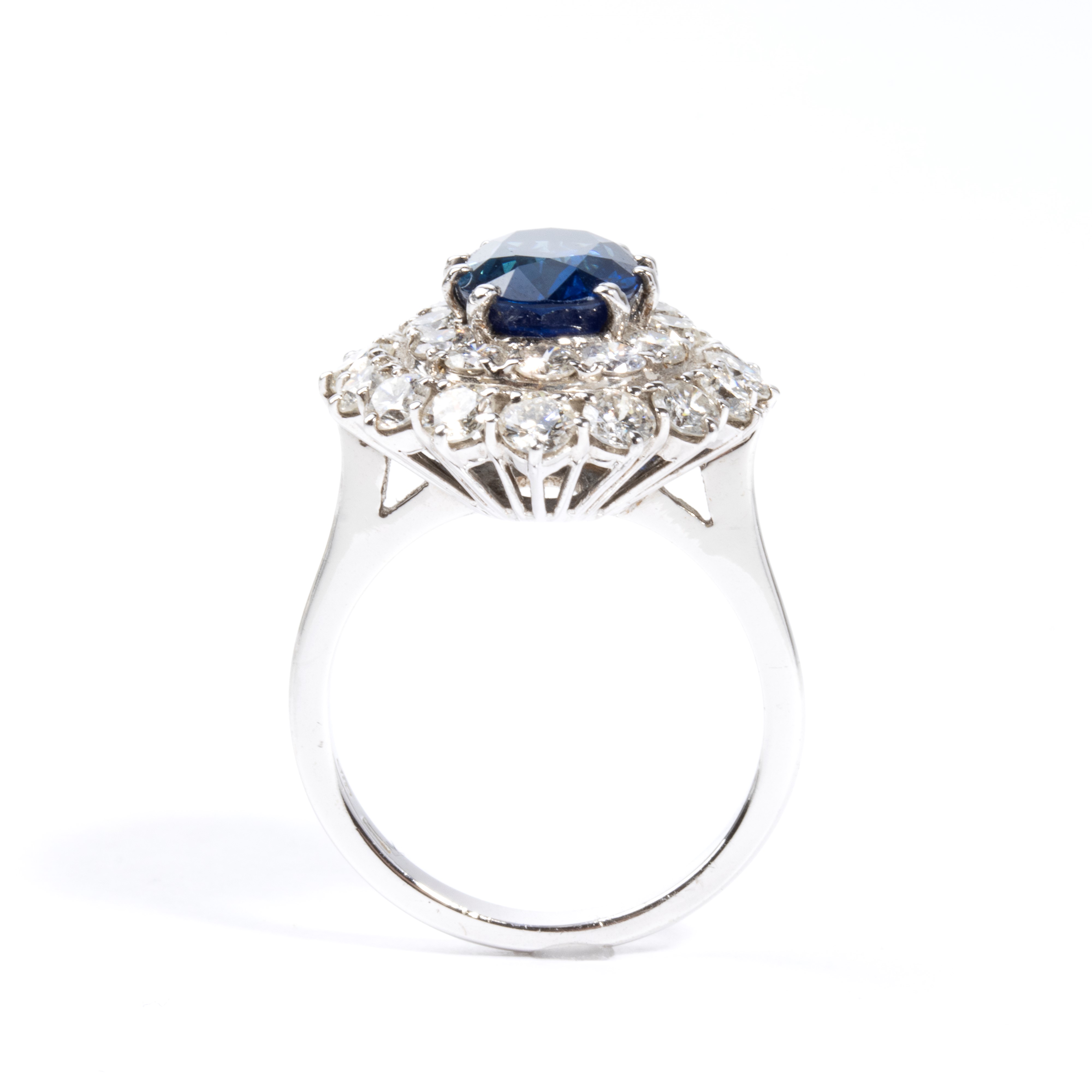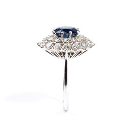 18k white and yellow gold, set with oval shaped blue sapphire, surrounded by pave set diamonds.