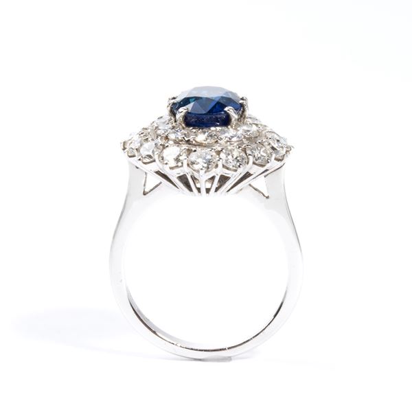 Round brilliant-cut diamonds, and rectangular, step cut diamonds, estimated total weight approx. 3.76 ct, colour F-G, clarity VVS-VS, and n.01 oval shape, composite-cut sapphire, approx. 2.42 ct, as measured and graded in the mount.