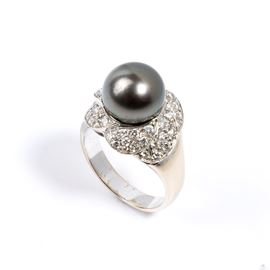18k white gold, floral motif with a central Tahitian pearl and diamond pave set petals.