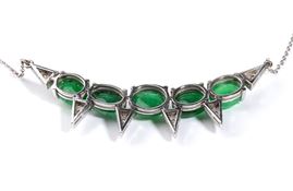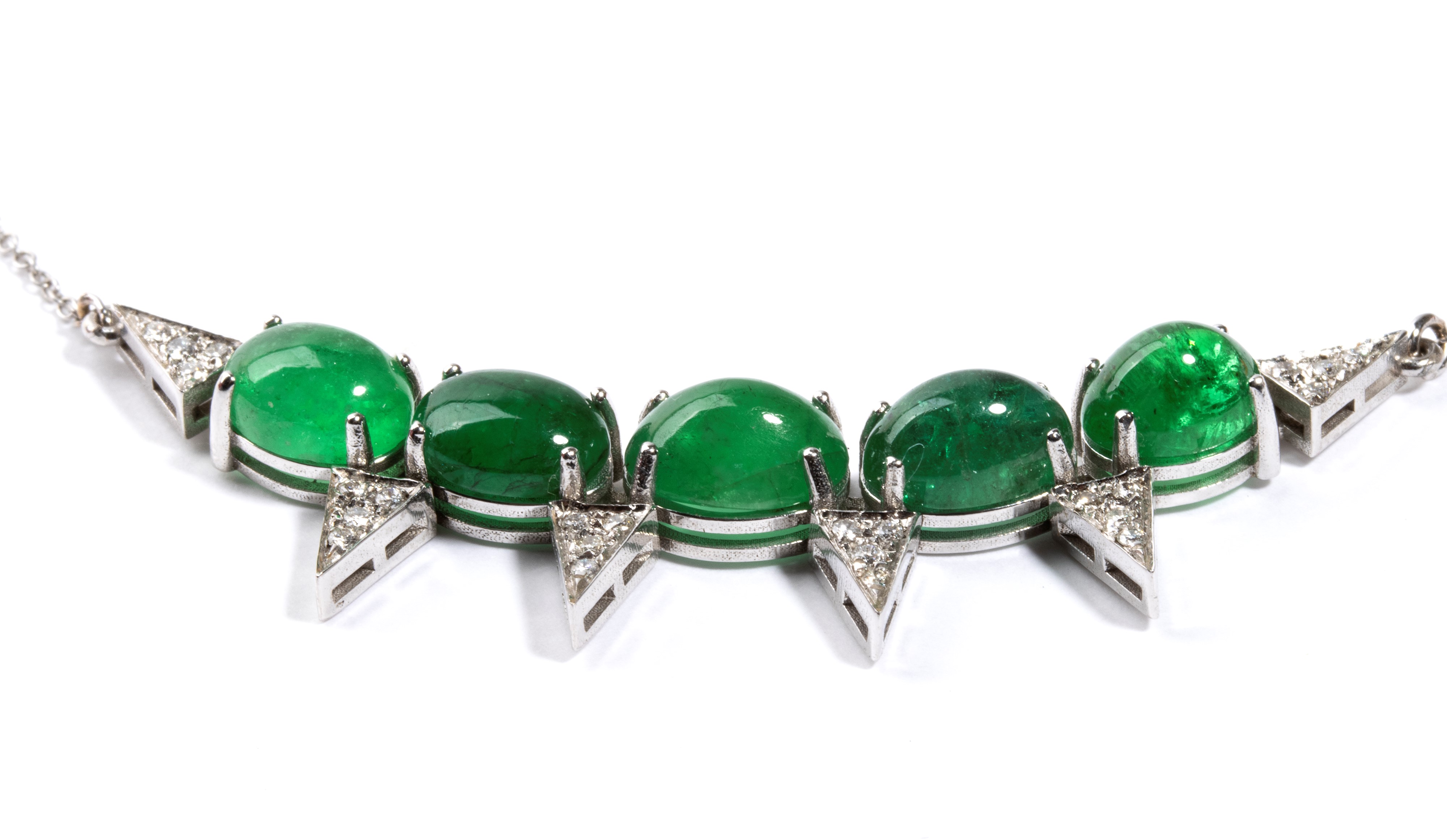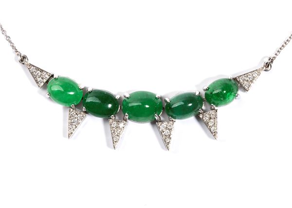18kt white gold, with a thin necklace chain with a central curved bar featuring a row of cabochon-cut emeralds and geometric diamond elements.