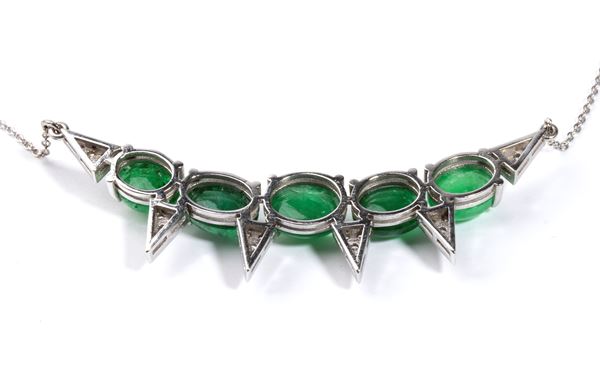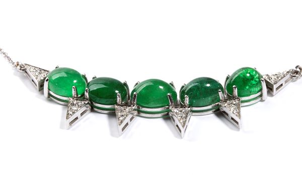 N. 05 oval shaped, cabochon-cut emeralds, estimated total weight approx. 12.79 ct and n. 24 round brilliant-cut diamonds, estimated to weigh a total of approx. 0.18 ct, G colour, VS-SI clarity, as gauged and graded in the mount.