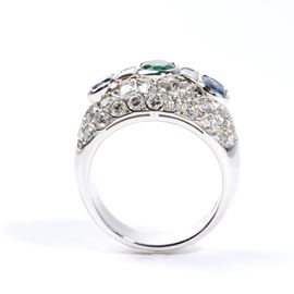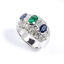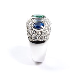 18k white gold, set with a couple of blue sapphires and one oval emerald surrounded by diamonds.