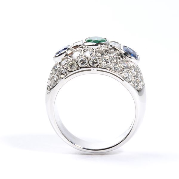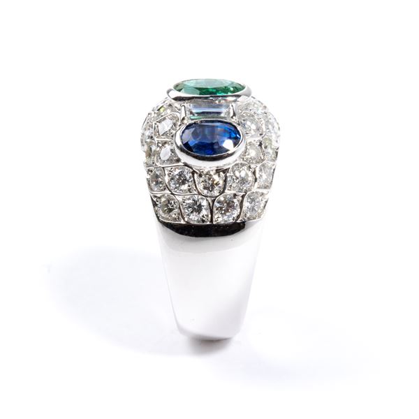 N. 40 round brilliant diamonds and n. 02 rectangular step cut diamonds, estimated to weight a total of approx. 1.60 ct, F-G colour, VVS clarity, n. 02 blue sapphires, oval shaped, composite cut, estimated to weigh a total of approx. 2.54 ct and n. 01 oval shaped, composite cut emerald, estimated to weigh a total of approx. 0.85 ct, gauged and graded in the mount.