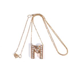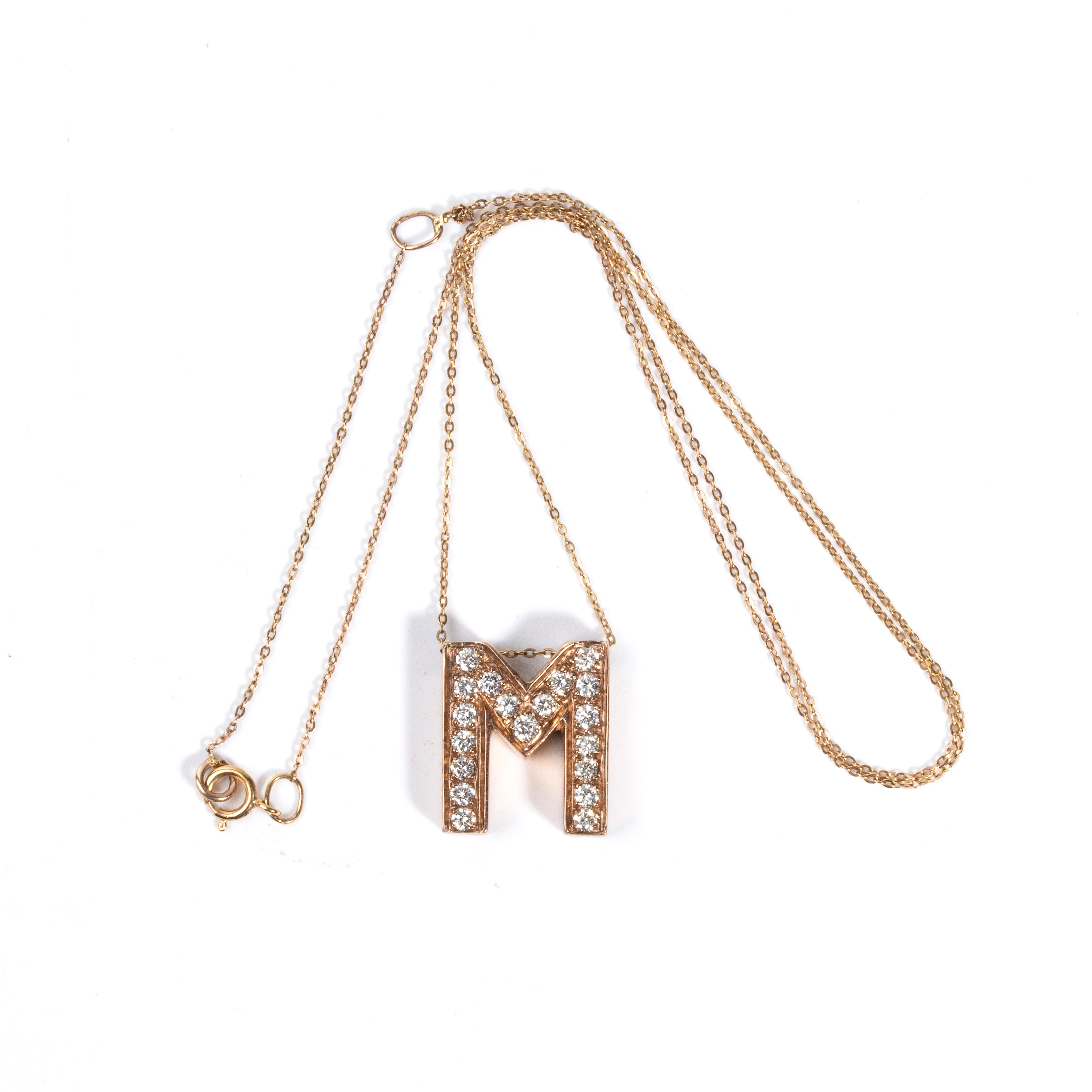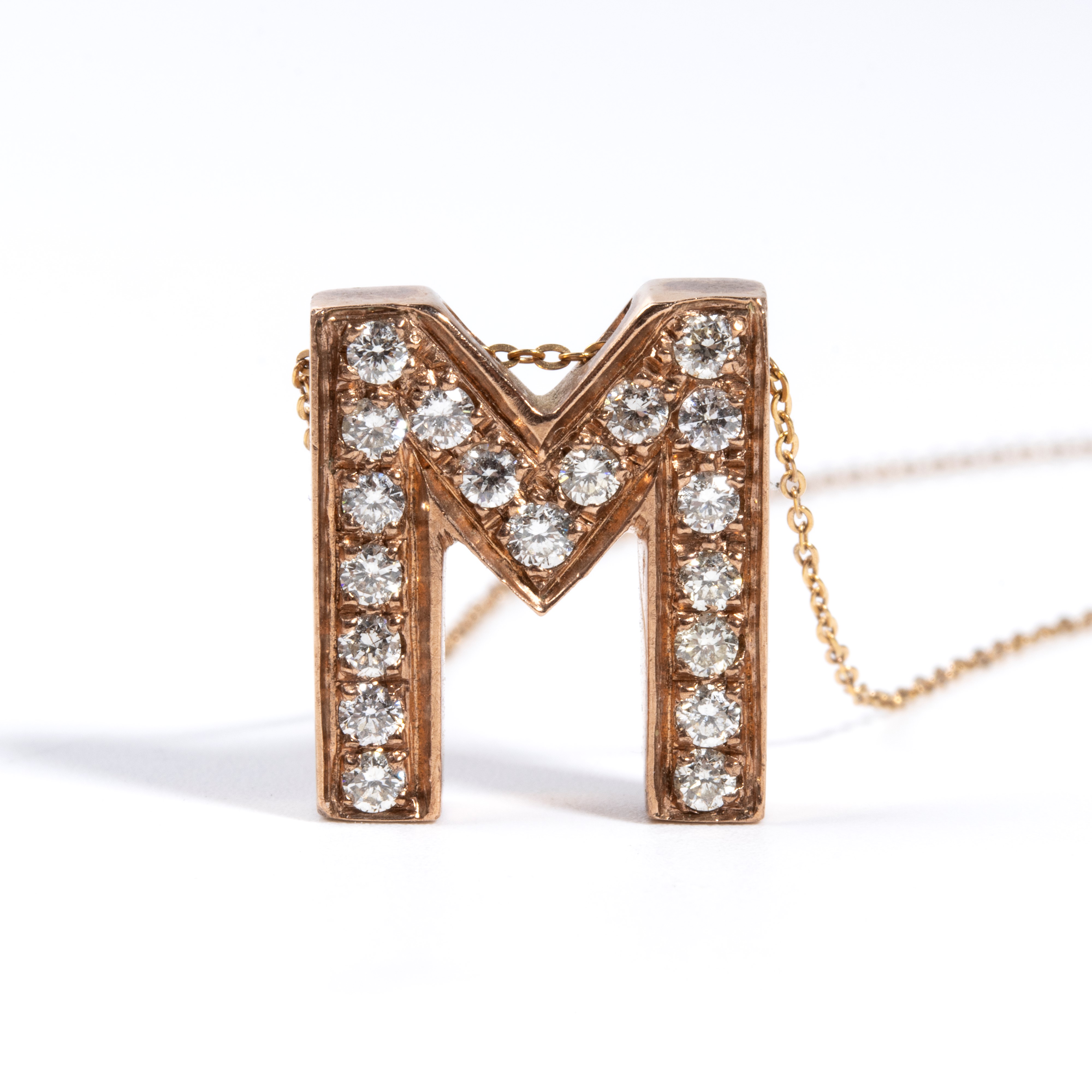 18k pink and yellow gold, with a delicate chain from which hangs a pendant in the shape of the letter "M", set with round brilliant cut diamonds estimated to weight a total of approx. 0.50 ct, G-H colour, VS-SI clarity.