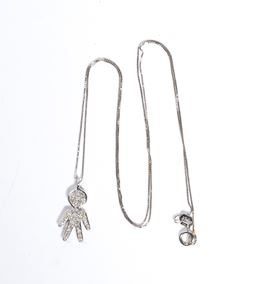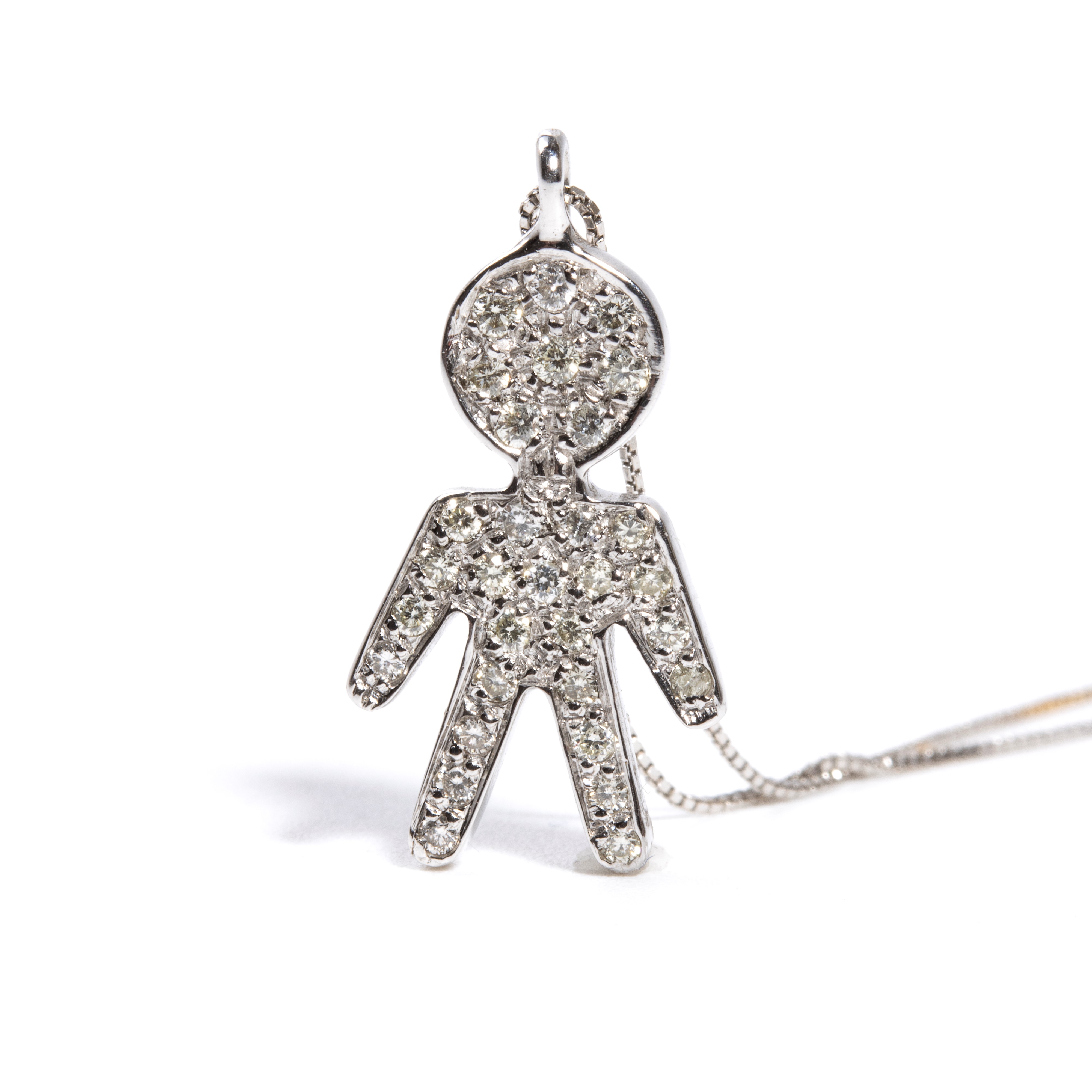 18k white gold, with a delicate chain from which hangs a pendant in the shape of a little man with pavé set round brilliant cut diamonds, estimated total weight approx. 0.20 ct, colour G-H, clarity VVS-VS.
