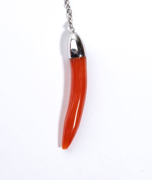 18k white gold, with thin chain from which hangs a pendant featuring a scaramantic Mediterranean coral horn (Corallium Rubrum) surmounted by fancy color brown diamonds estimated to weigh a total of approx. 0.10 ct.
