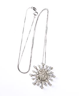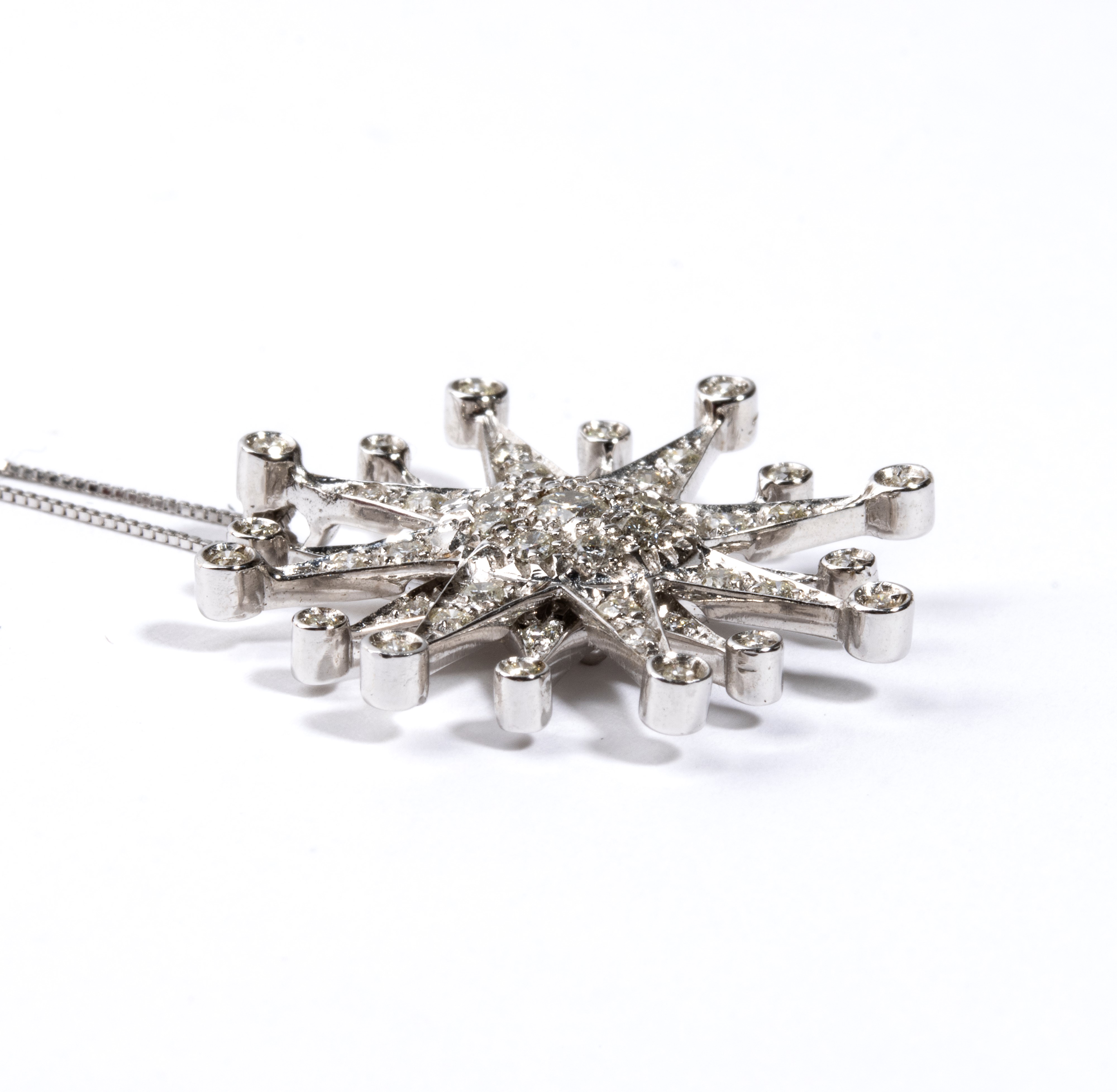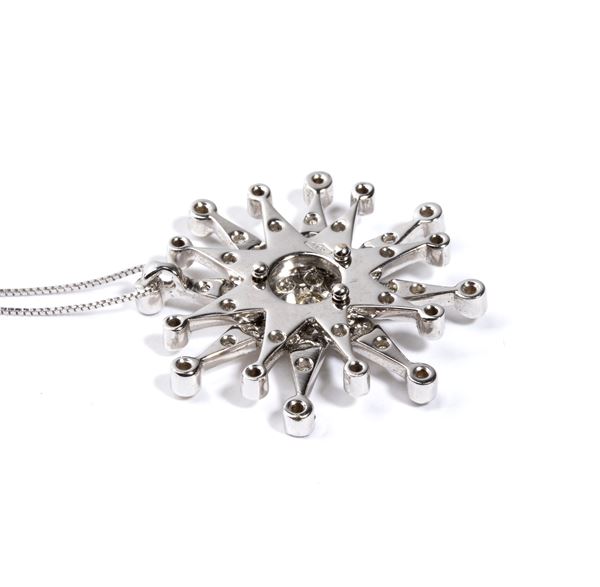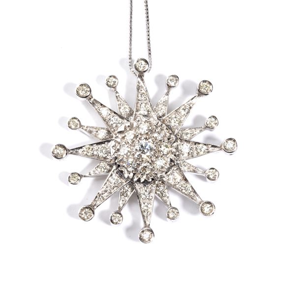 18k white gold, with thin chain from which hangs a pendant featuring the stylised silhouette of a sun, with pave set round brilliant-cut diamonds, estimated to weigh a total of approx. 1.00 ct, H colour, VS clarity, as gauged and graded in the mount.