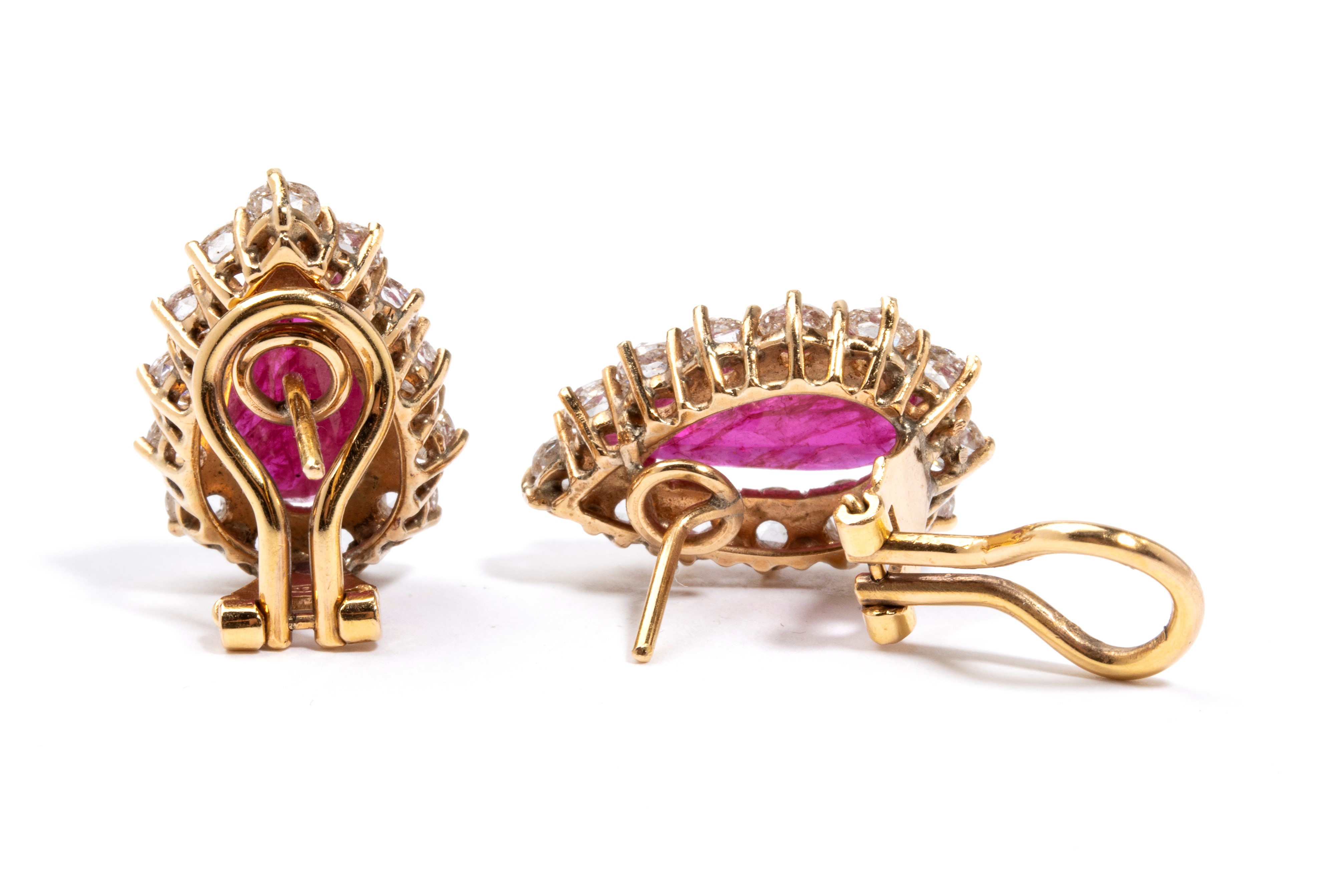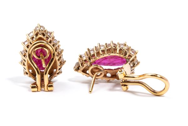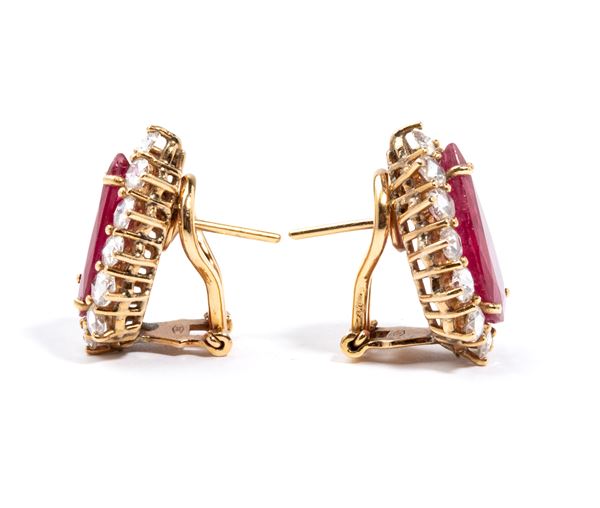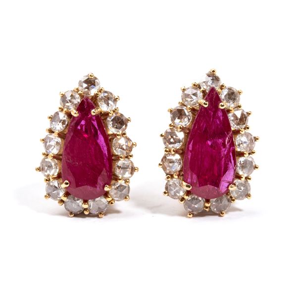 18k yellow gold, each set with a pear shaped ruby framed by rose cut diamonds.