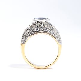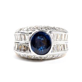 18k yellow and white gold, set with an oval sapphire surrounded by baguette-cut and brilliant-cut diamonds.