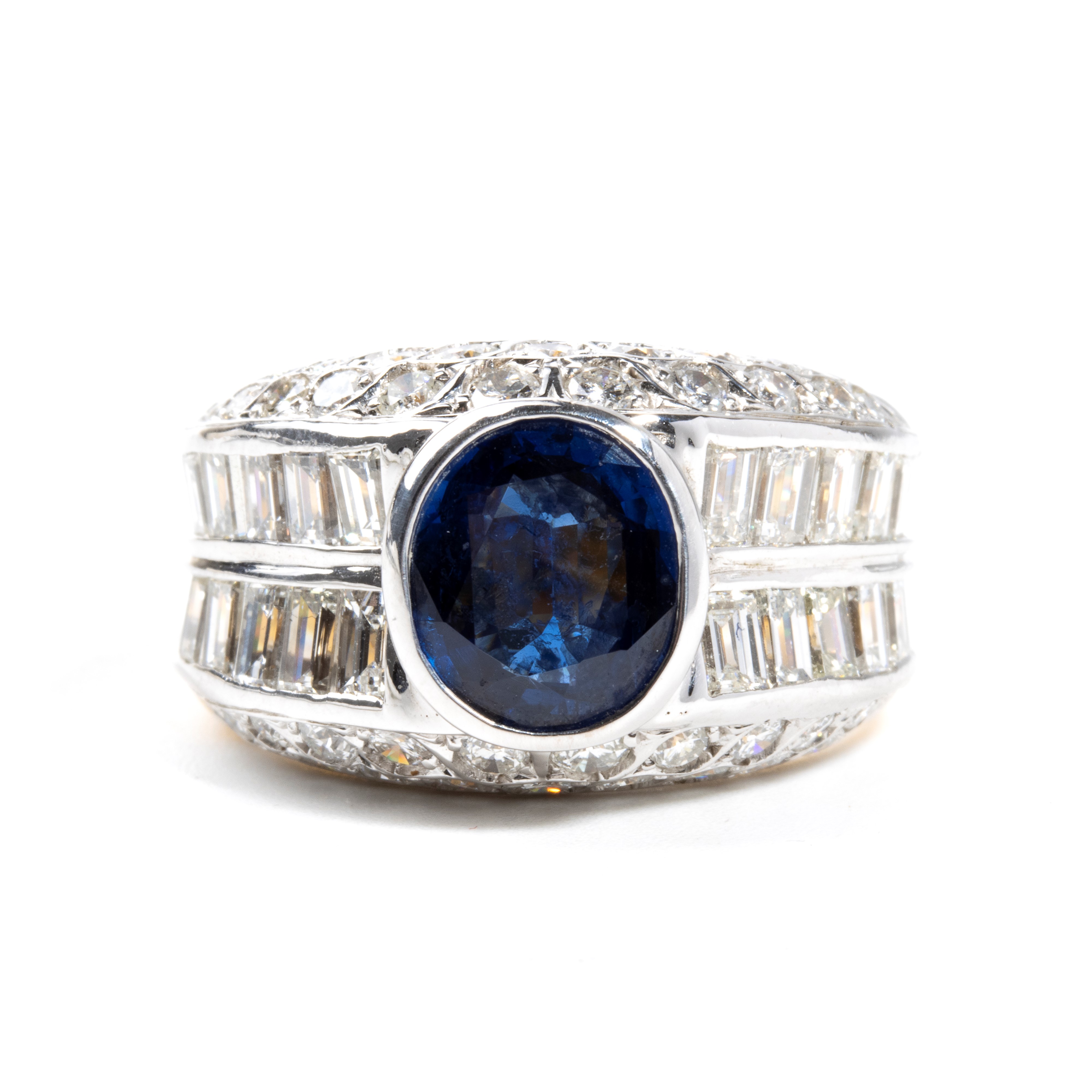N. 01 oval-shaped sapphire, composite cut, estimated weight approx. 2.42 ct; round brilliant-cut diamonds and rectangular step-cut diamonds, estimated total weight approx. 3.76 ct, colour F-G, clarity VVS-VS, as measured and graded in the setting.