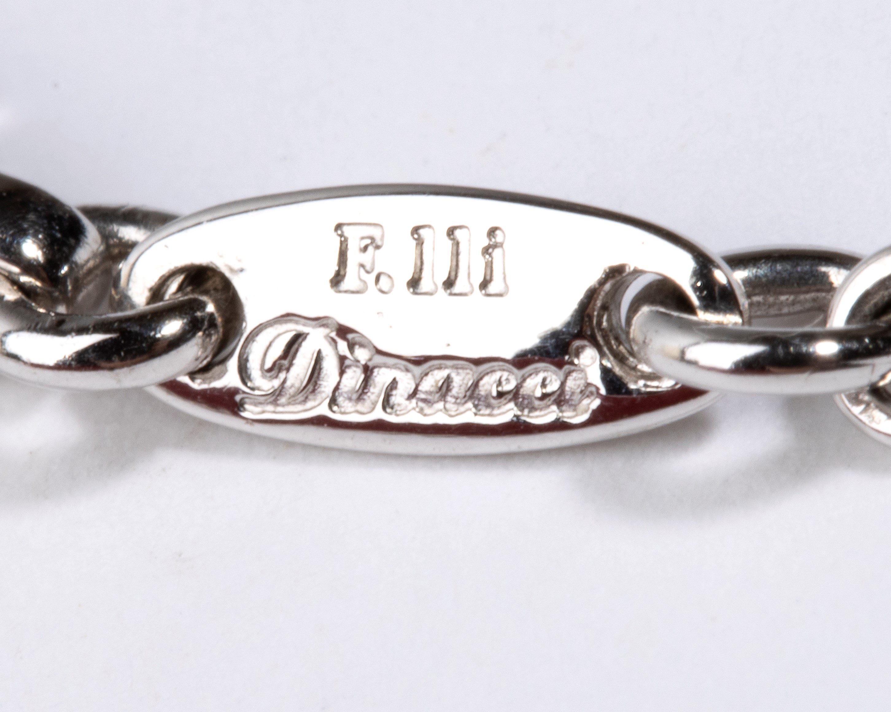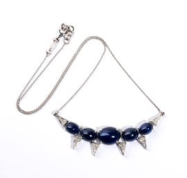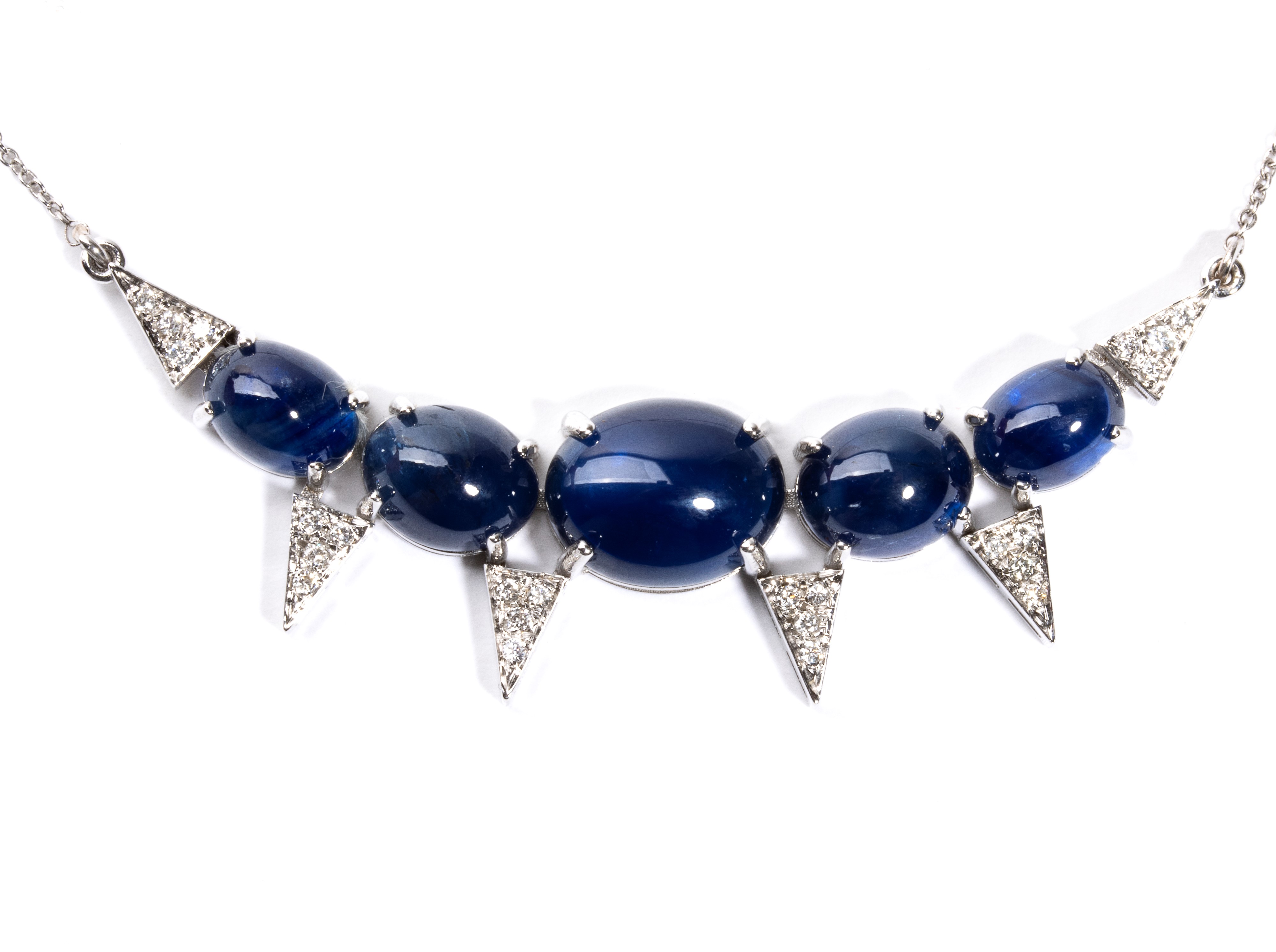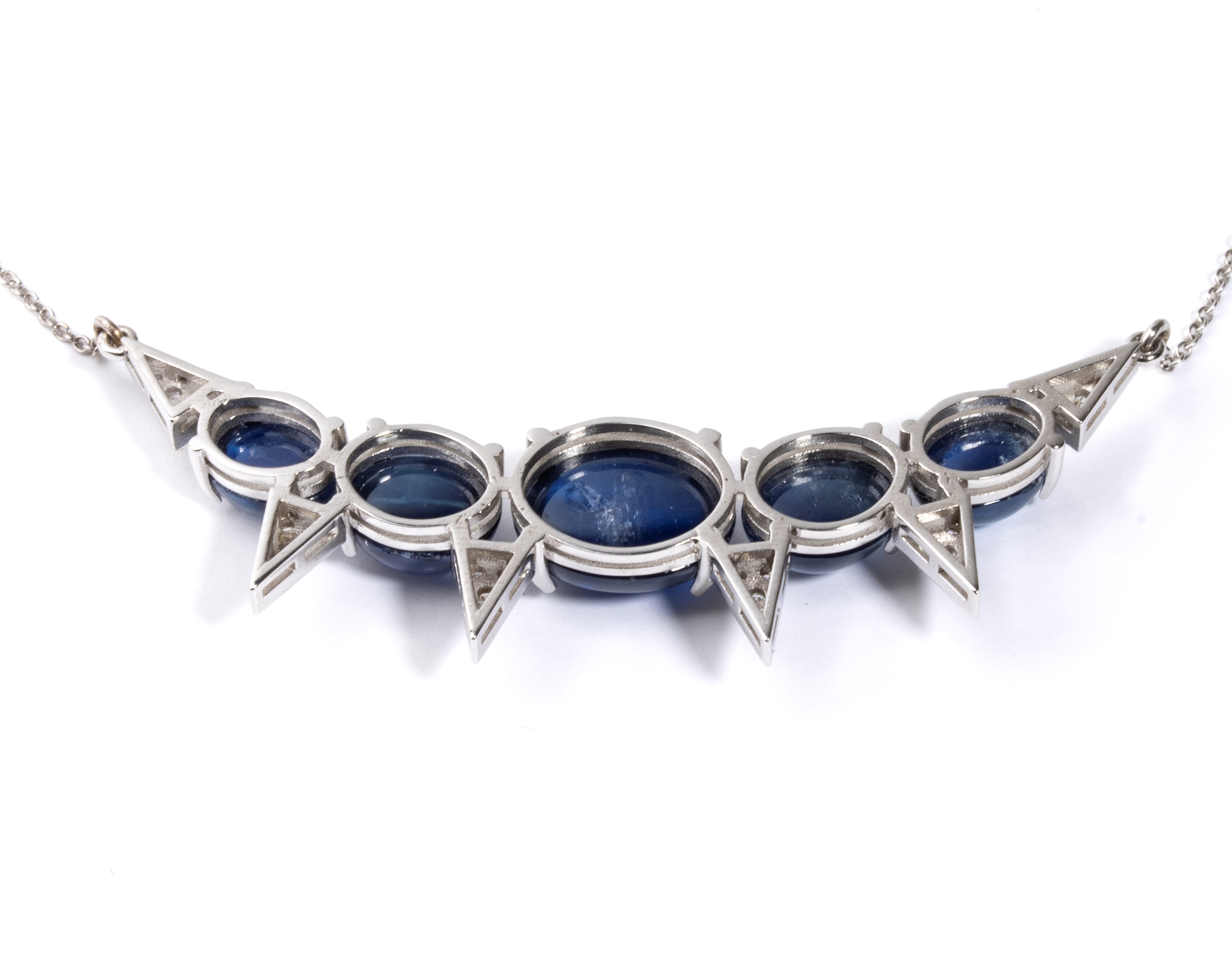 18kt white gold, with a thin necklace chain with a central curved bar featuring a row of cabochon-cut blue sapphires and geometric diamond elements.