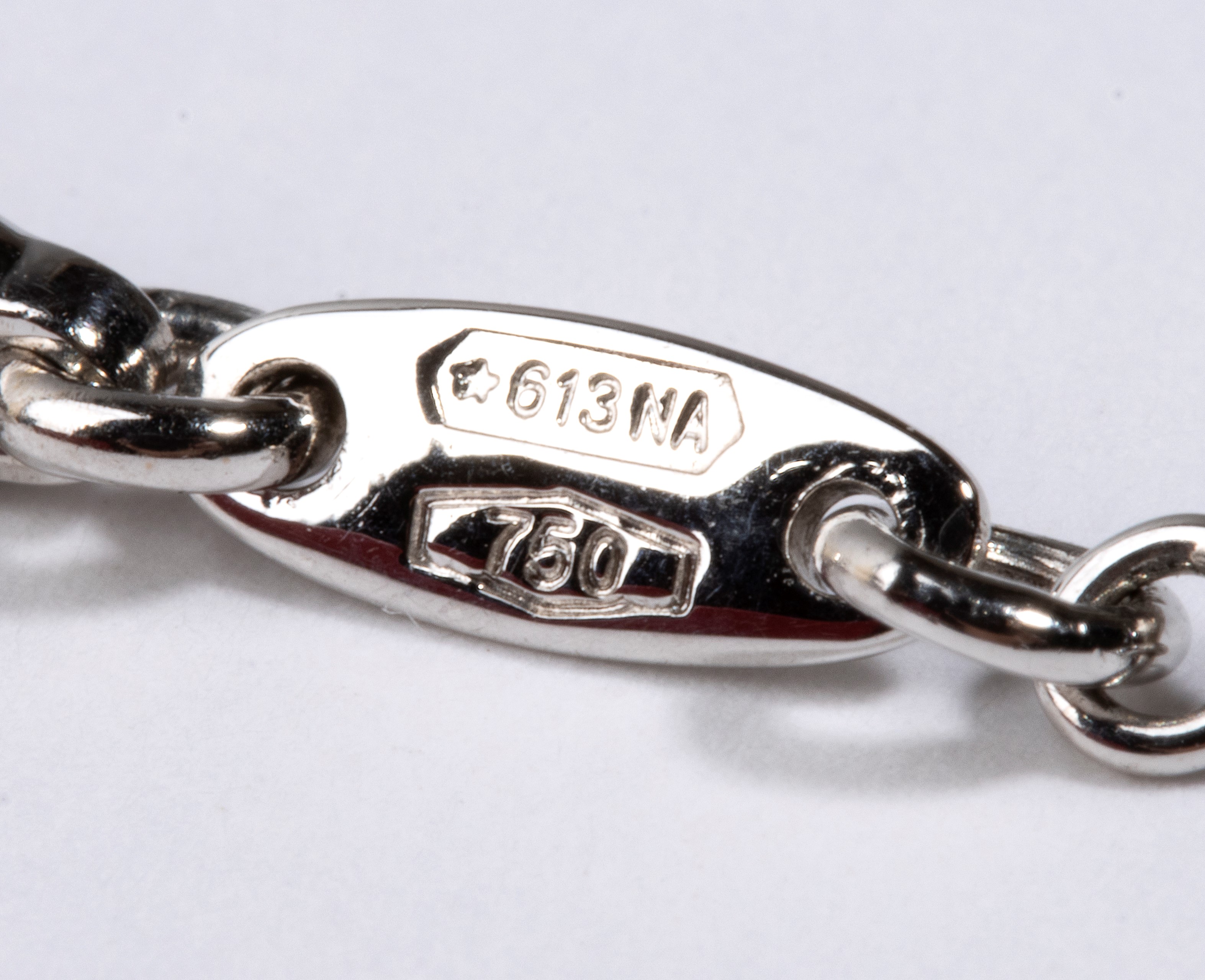Hallmarked “750 – 613 NA”. Necklace length: 40 cm. Curved bar length: 6 cm. Weight: 8.3 g