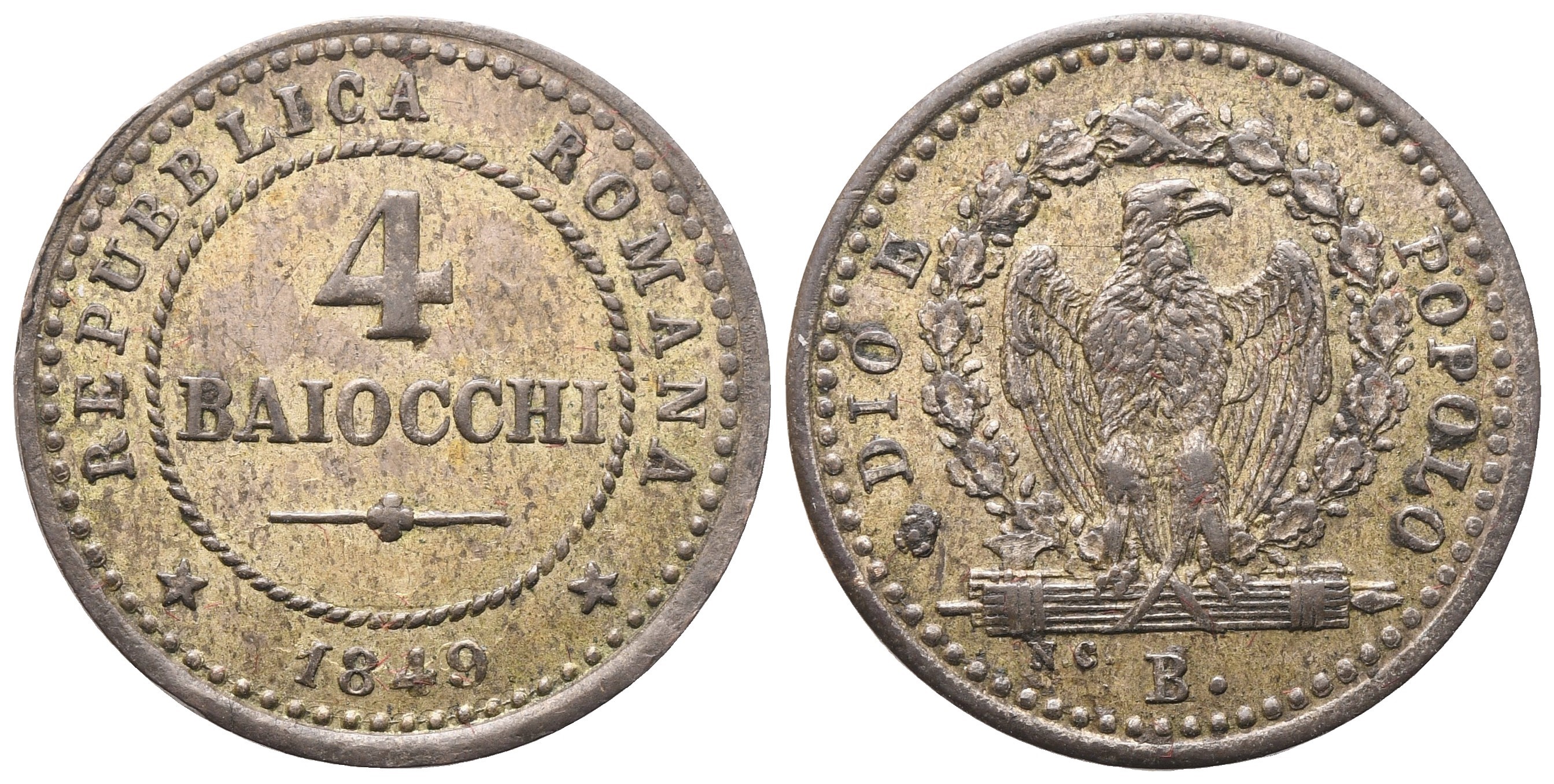 REPUBBLICA ROMANA 1849 Nel centro, 4 / BAIOCCHI entro cerchio perlinato. Rv. DIO E / POPOLO Aquila su fascio volta a destra entro corona di quercia; sotto al fascio, a sinistra, N C; in basso, B. Gig. 5. SPL+