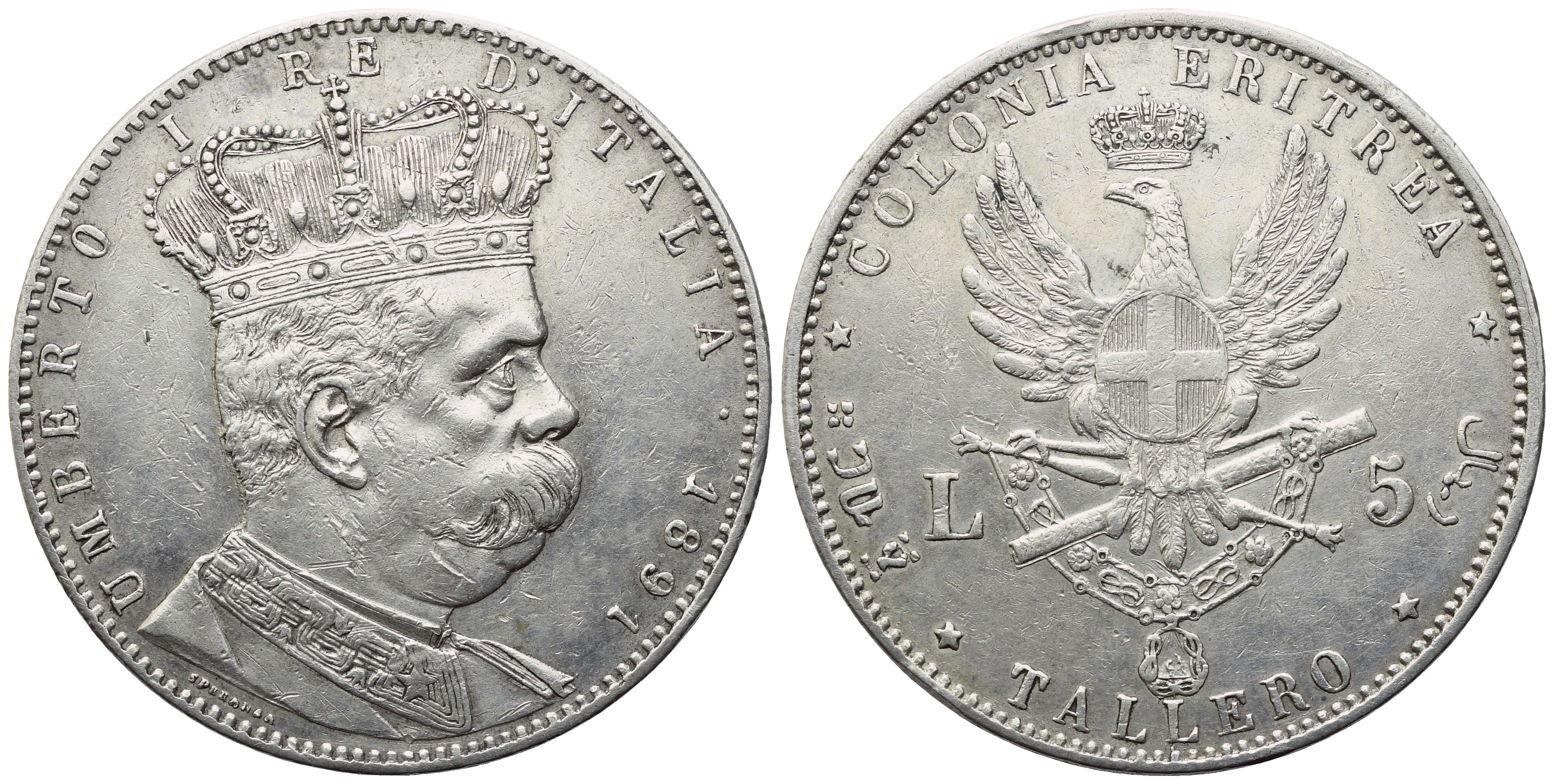 Zecca: Roma. UMBERTO I RE D'ITALIA 1891 Busto coronato in uniforme a destra; in basso, SPERANZA (Filippo Speranza, incisore). Rv. COLONIA ERITREA / (valore in amarico) / TALLERO / (valore in arabo) Aquila coronata con ali spiegate e caricata in petto dello scudo sabaudo, tra L – 5; tra gli artigli lo scettro ed il bastone decussati, da cui pende il Collare dell'Annunziata. Gig. 1; Mont. 80; Pag. 630. Rara. BB/SPL. Segnetti.