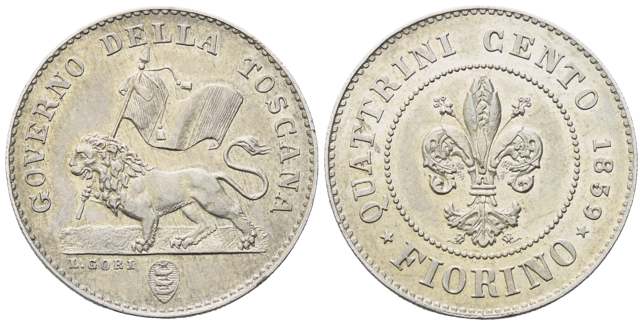 GOVERNO DELLA TOSCANA Leone gradiente a sinistra con bandiera italiana; in esergo, L GORI e armetta Guicciardini. Rv. QUATTRINI CENTO 1859 FIORINO Giglio entro cerchio perlinato. Gig. 2; Pag. 228; MIR 467. qFDC. Fondi lucenti.
