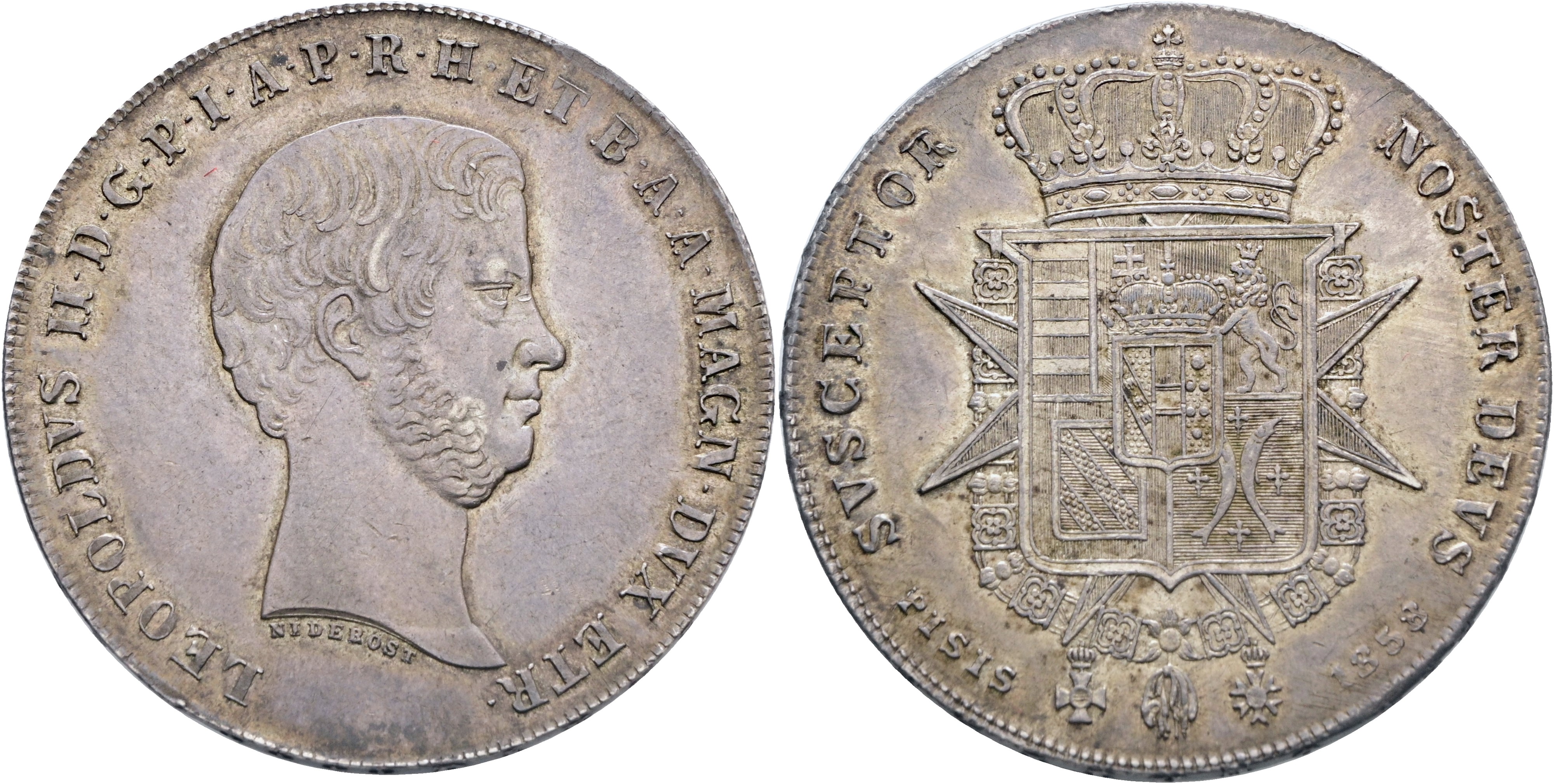 LEOPOLDVS II D G P I A P R H ET B A A MAGN DVX ETR Testa nuda adulta a destra, sotto il collo NIDERÖST e, in basso, marchio di zecca. Rv. SVSCEPTOR NOSTER DEVS Stemma coronato su croce di Santo Stefano e il collare del Toson d'Oro; in basso, PISIS – 1858. Gig. 24. FDC. Moneta in conservazione eccezionale corredata da splendida patina di antica collezione su fondi lucenti.
