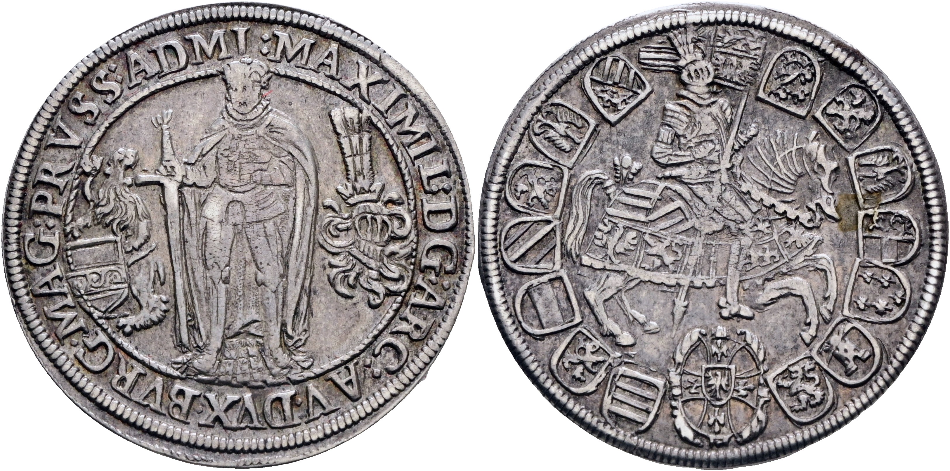 Zecca: Hall. MAXIMIL D G ARC AV DVX BVRG MAG PRVSS ADMI Gran Maestro coronato e corazzato, stante di fronte, impugna lo spadone con la destra; a sinistra, lo stemma d'Austria sorretto da un leone; a destra, elmo da parata. Rv: L'Arciduca corazzato a cavallo a destra attorno corona di stemmi. KM 39. Cf. Dudik 229. Neumann 111. qSPL