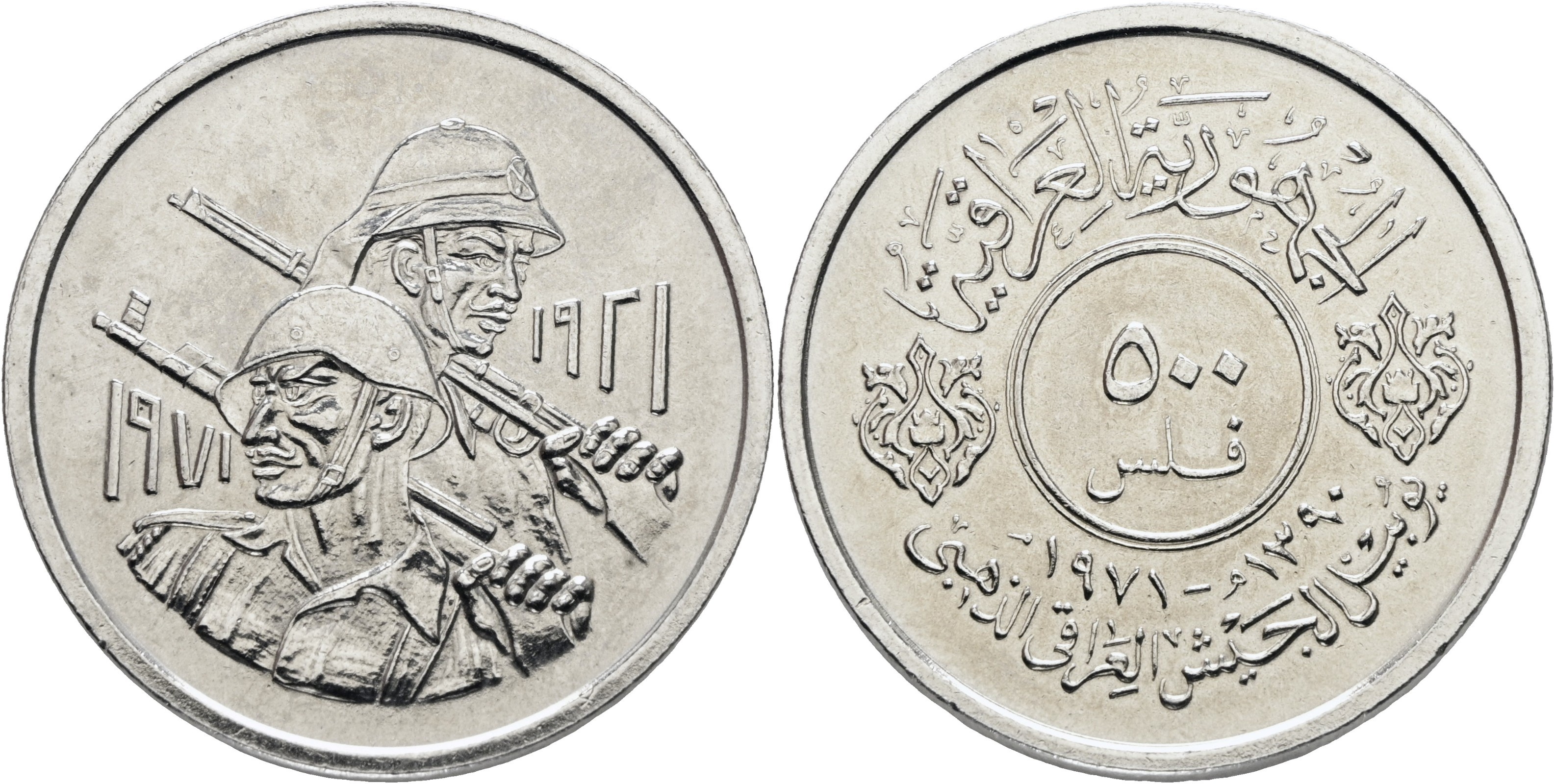 IRAQ. 500 fils 1971 (1390). Emissione commemorativa per il 50° anniversario dell'esercito iracheno; Ni (22,9 g)