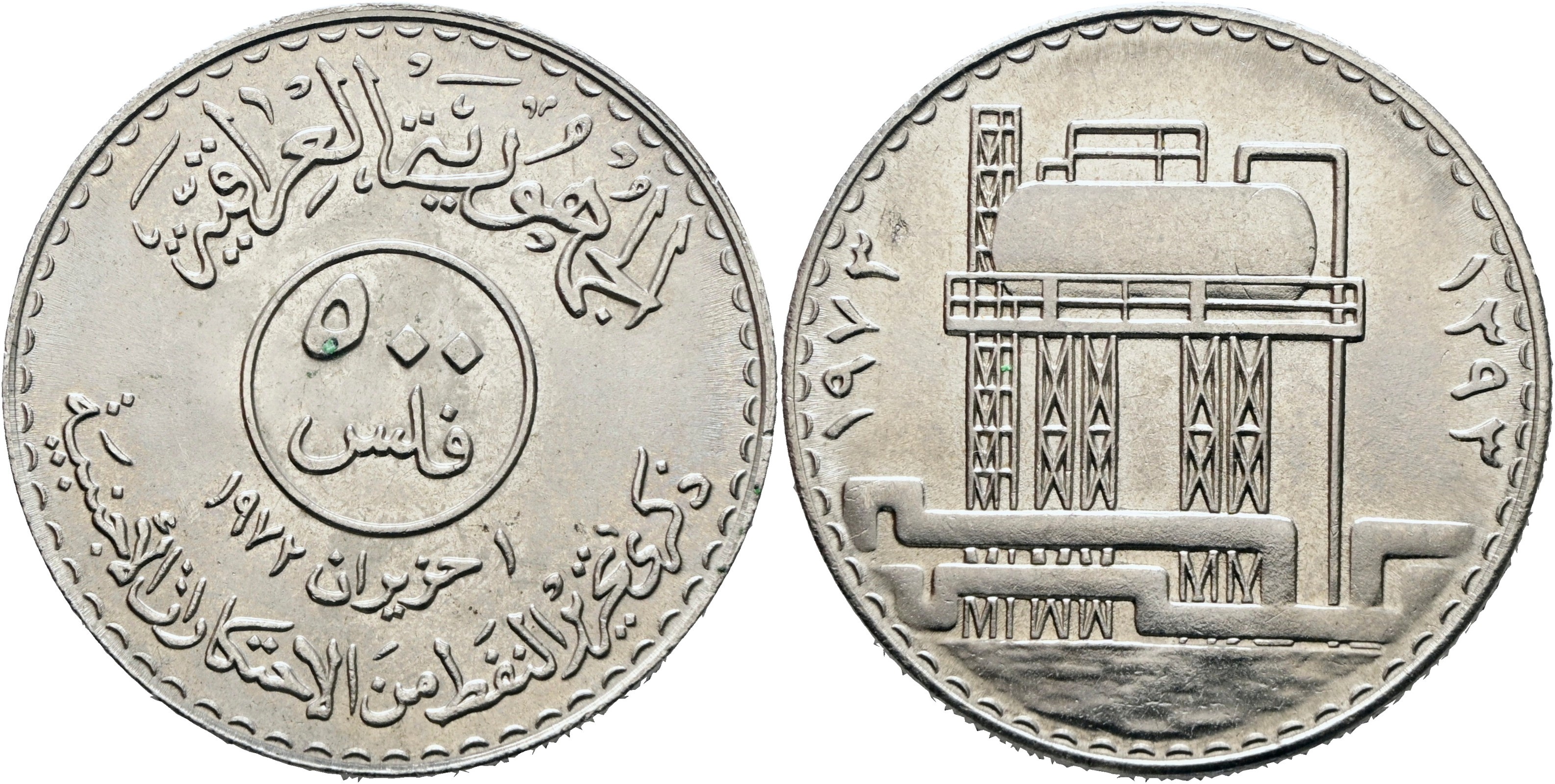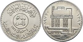 IRAQ. 500 fils 1973 (1393). Emissione commemorativa per il I anniversario della nazionalizzazione del petrolio; Ni (22,9 g)