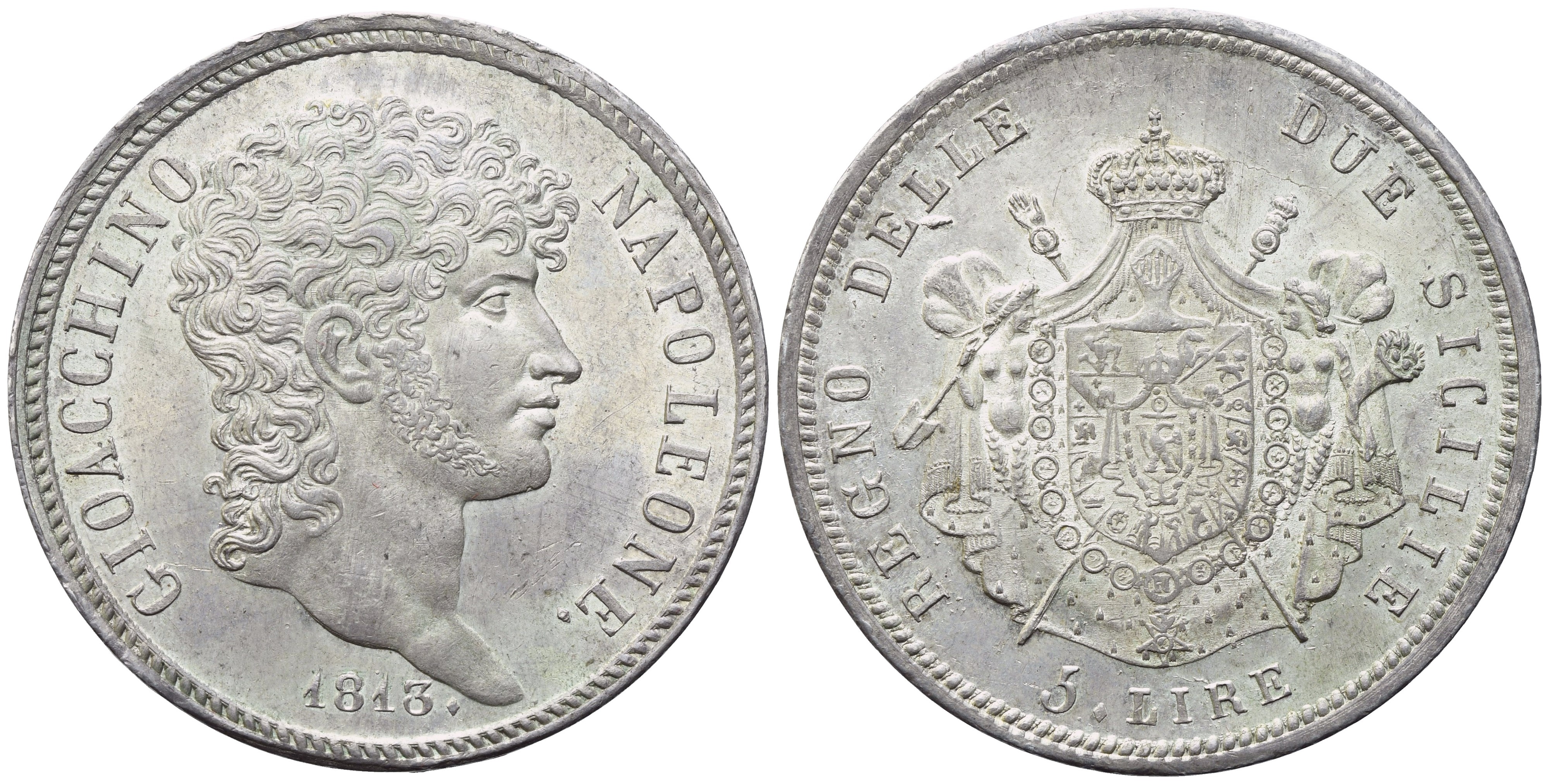 GIOACCHINO NAPOLEONE Testa nuda a destra; in basso, 1813. Rv. REGNO DELLE DUE SICILIE Stemma coronato su padiglione; in basso, 5 LIRE. Gig. 12; Pannuti-Riccio 13; MIR 441/1. Raro. qFDC. Ritratto eccezionale. Fondi lucenti. Straordinario esemplare.