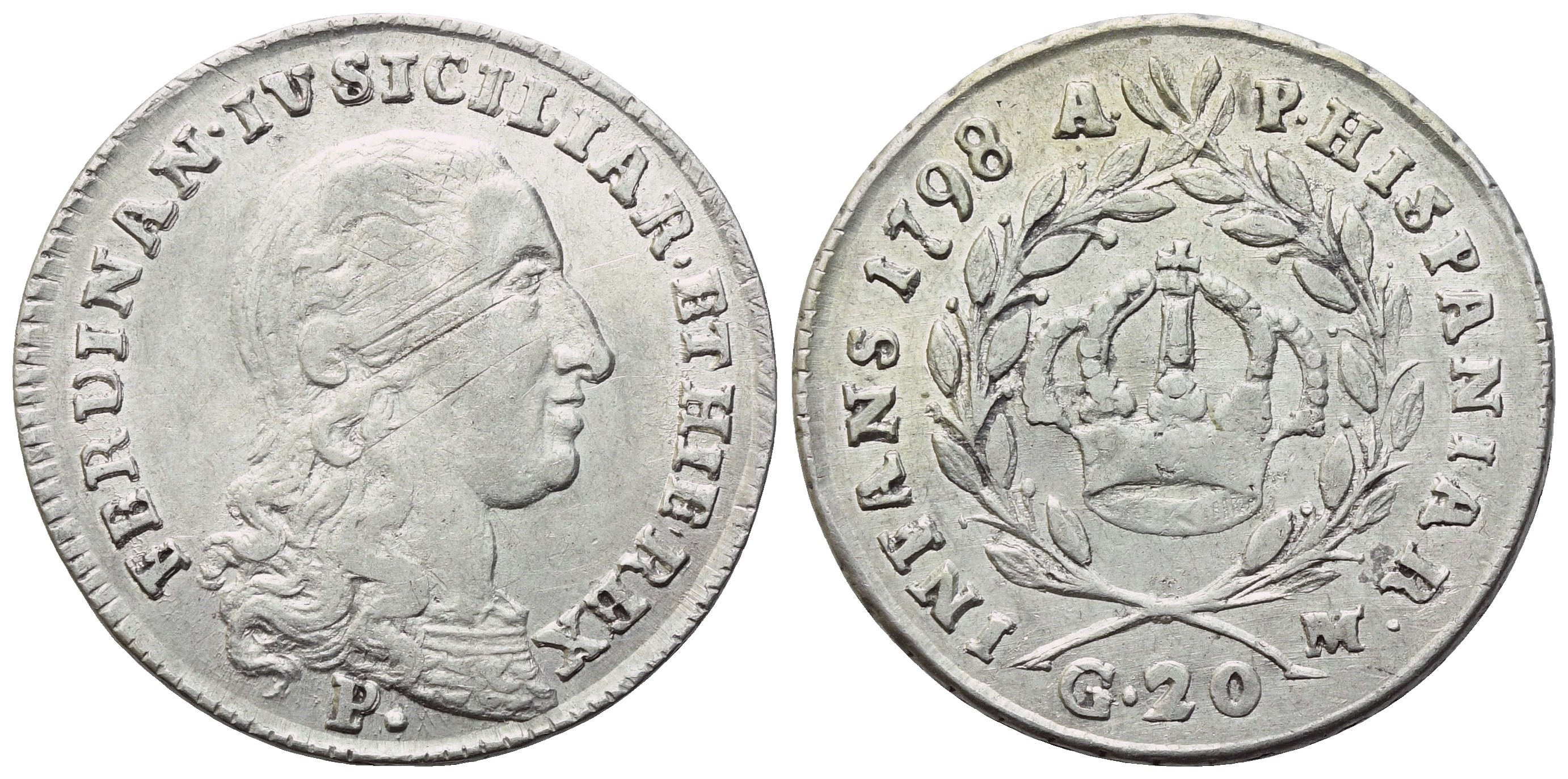 FERDINAN IV SICILIAR ET HIE REX Busto a destra; in basso, P. Rv. HISPANIAR INFANS 1798 Corona reale entro due rami di lauro ra A / P / M; in basso, G. Gig. 104. SPL/qSPL. Graffi di conio al dritto. Fondi lucenti.