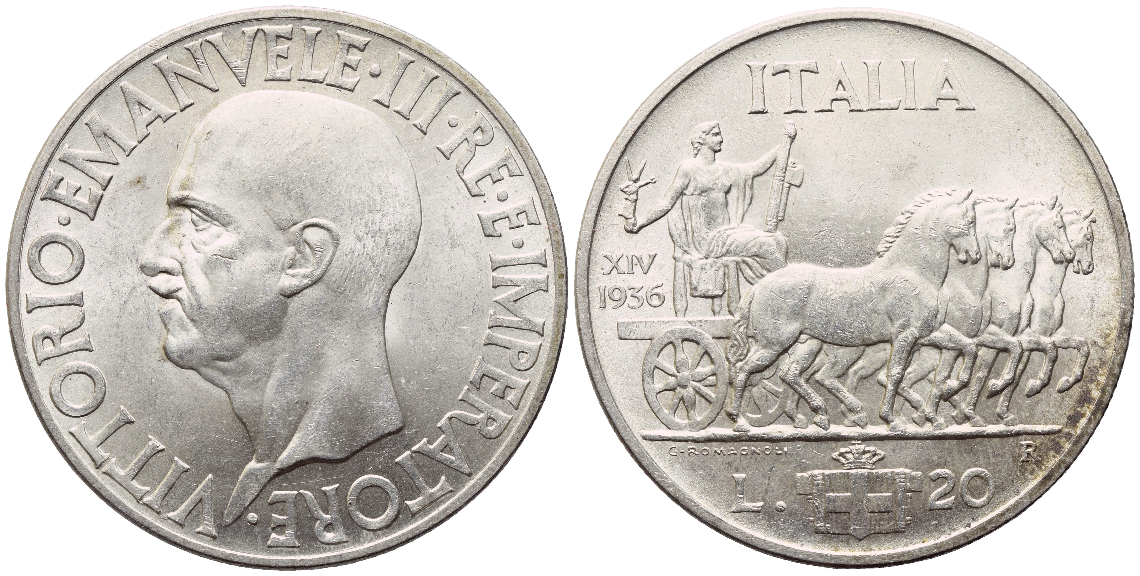 VITTORIO EMANUELE III RE E IMPERATORE Testa nuda a sinistra. Rv. ITALIA L'Italia, con Vittoriola e fascio, seduta su quadriga lenta a destra; dietro, XIV / 1936. In esergo, in alto, G ROMAGNOLI – R; in basso, stemma sabaudo coronato con fasci ai lati, tra L – 20. Gig. 45. qFDC. Impercettibili segnetti da contatto ma esemplare eccezionale con ottimo lustro.