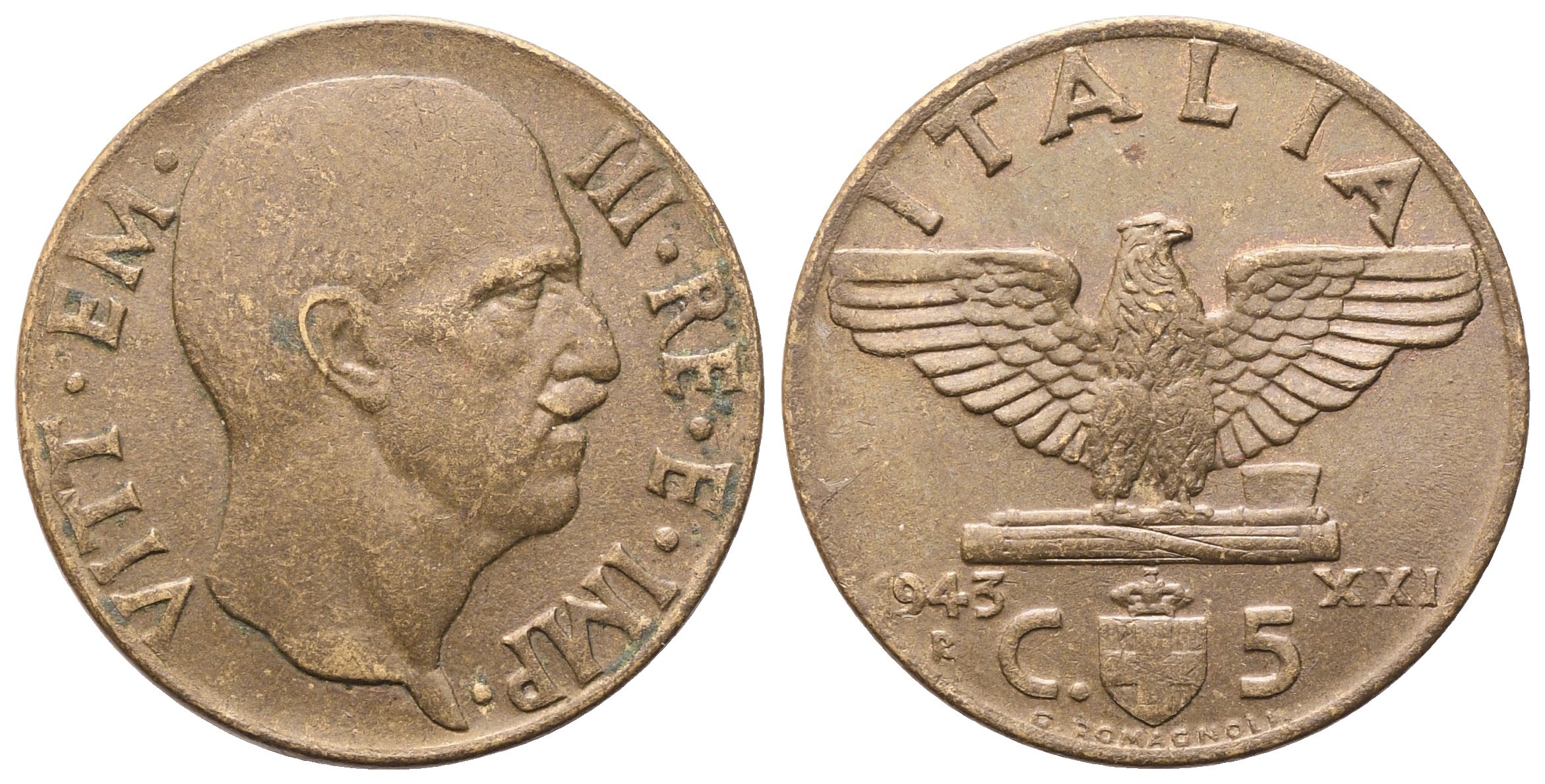 VITT EM III RE E IMP Testa nuda a destra. Rv. ITALIA Aquila ad ali spiegate su fascio. Sotto il fascio, stemma sabaudo tra 1943 – XXI / R C 5; in basso, G ROMAGNOLI. Gig. 292. Rara. qFDC