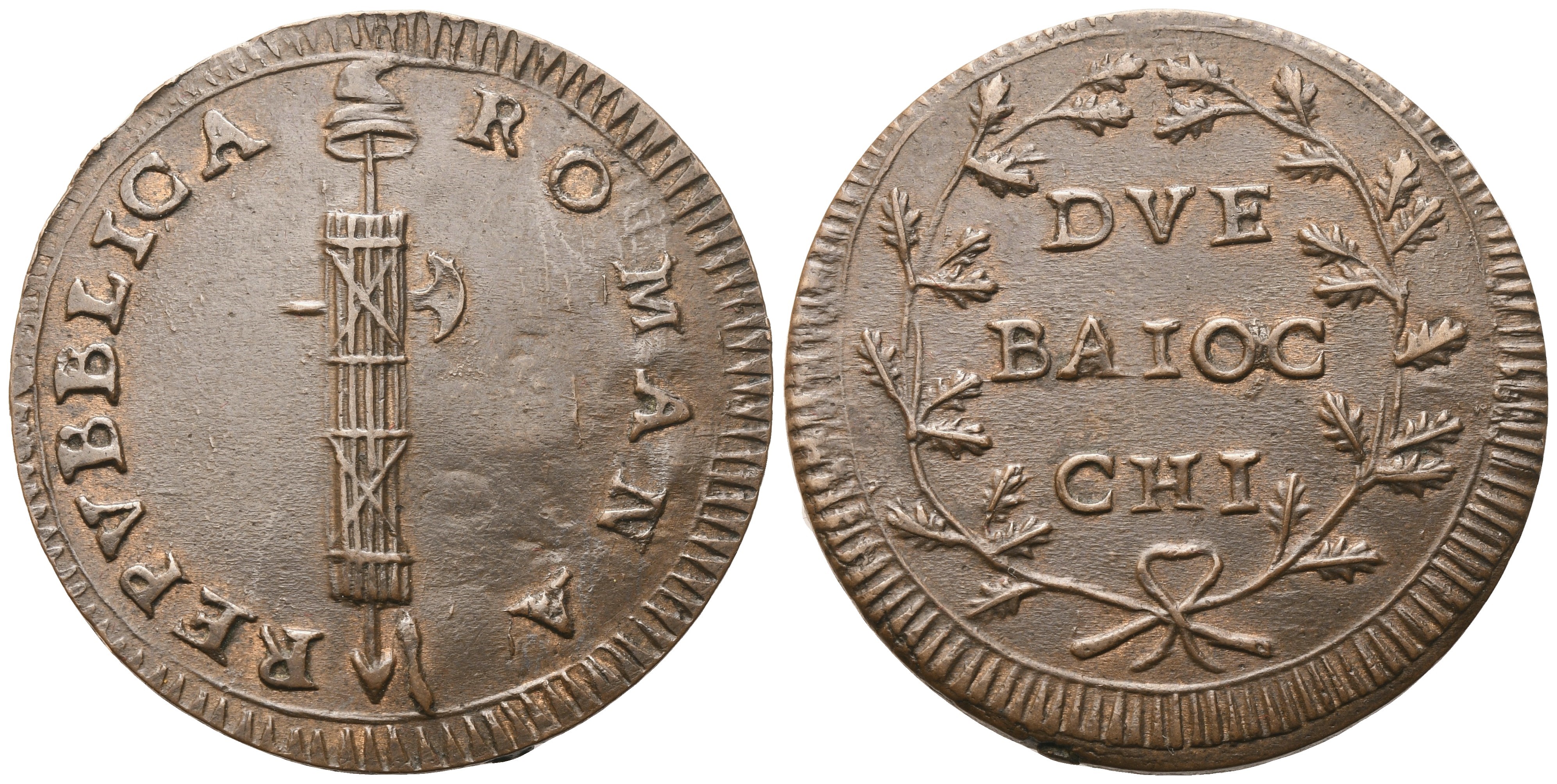 REPVBBLICA ROMANA Fascio littorio con scure e pileo a destra. Rv. DVE BAIOCCHI tra rami di quercia, legati in basso con nastro. Bruni 12; Munt. –; Pag –; Cni – Estremamente rara. SPL+. Gradevolissima patina marrone.