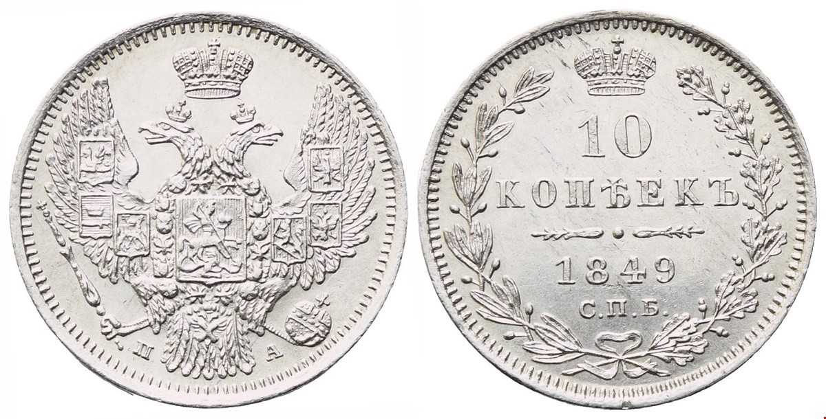 Zecca: San Pietroburgo. Aquila bicipite coronata. In basso, ai lati, П А. Rv. 10 / КОПѢЕКЪ / 1849 / С.П.Б. entro ghirlanda formata da un ramo di ulivo e uno di quercia. In alto, corona. Bitkin 373; Conros 161/45. qFDC