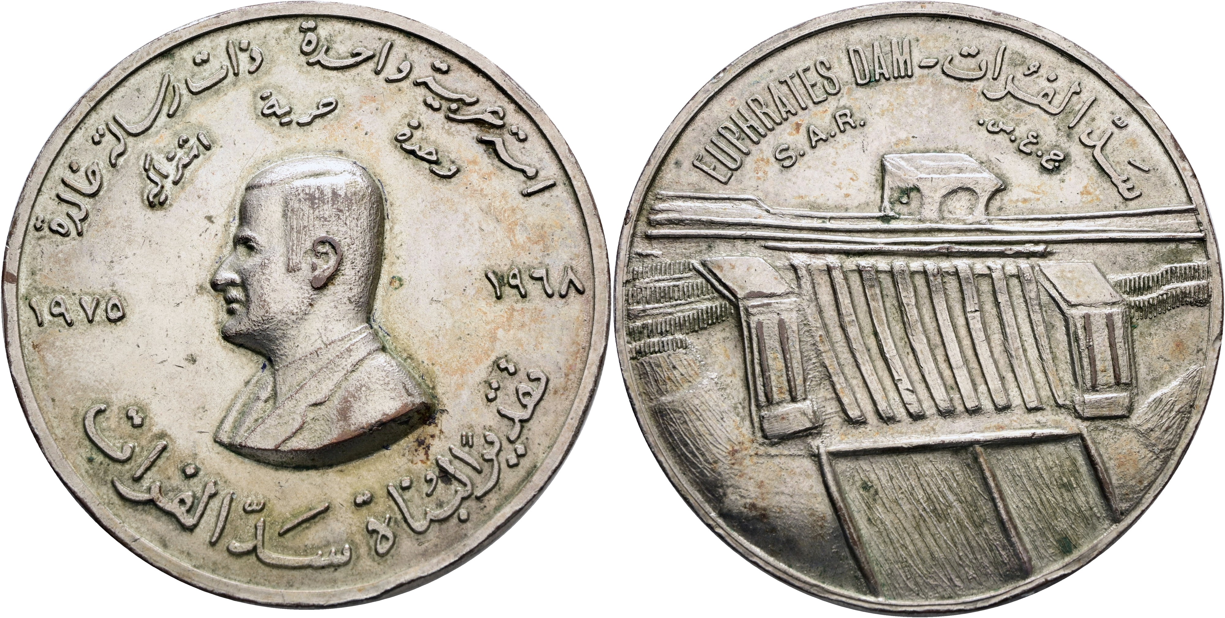 SIRIA. Afiz Al Assad (1971-2000). Medaglia per l'inaugurazione della diga di Tabqa (o Al Thawra) sull'Eufrate; Æ argentato (86,36 g; 62 mm)