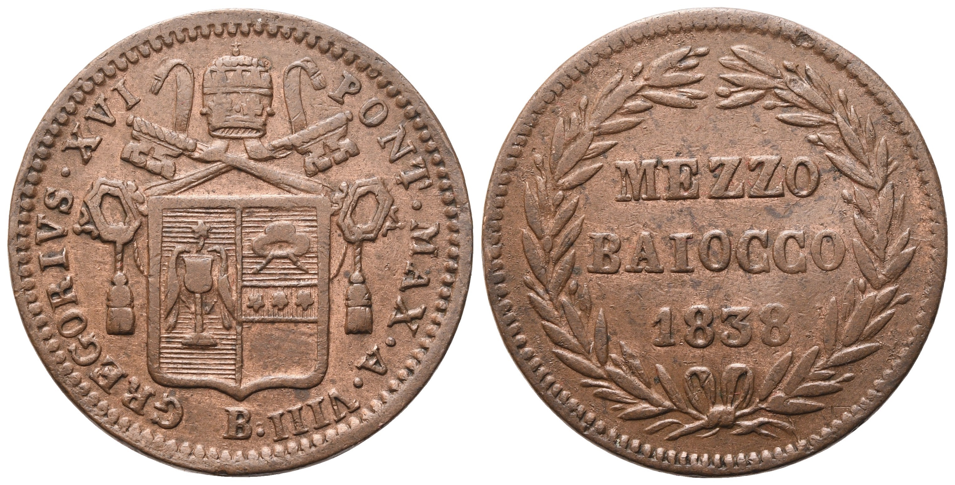 GREGORIVS XVI PONT MAX A VIII Stemma sormontato da triregno e chiavi decussate; in basso, B. Rv. MEZZO / BAIOCCO / 1838 tra due rami d'ulivo, legati in basso con fiocco. Gig. 195. SPL+. Patina marrone.